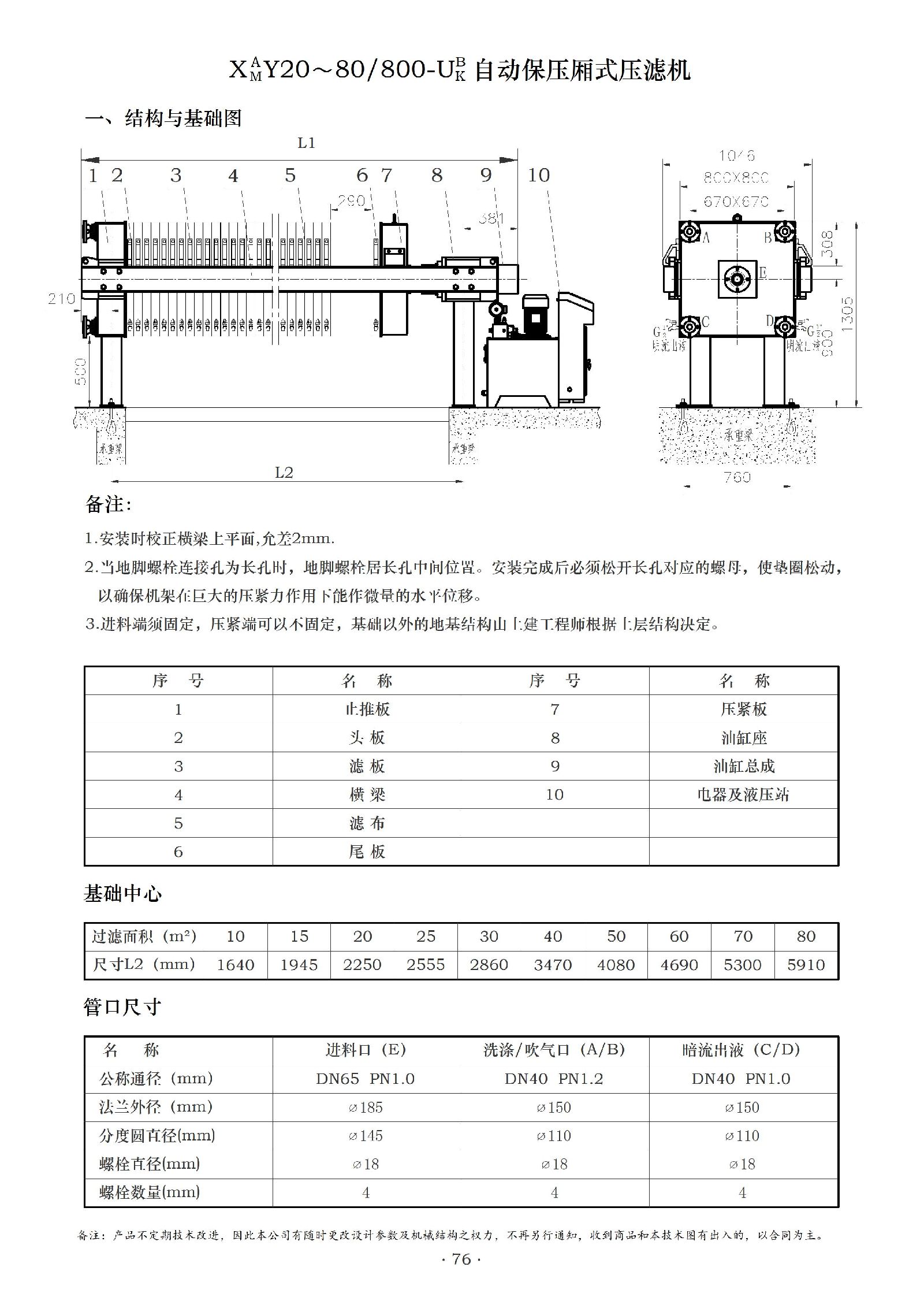 机架部分:由两根横梁把固定板和压紧装置连接在一起构成,是压滤机的支撑结构,用于固定和支撑其他部件,确保压滤机在工作过程中的稳定性。
