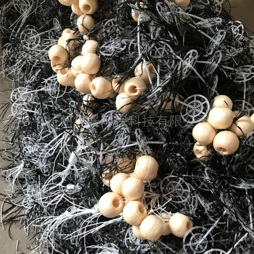 ① 碳素纤维生态草依靠其巨大的表面积和生物接触面积快速吸附水中的污浊物质,同时吸引水中的好碳素菌、高效聚磷菌等微生物聚集在材料表面加快初期粘合。