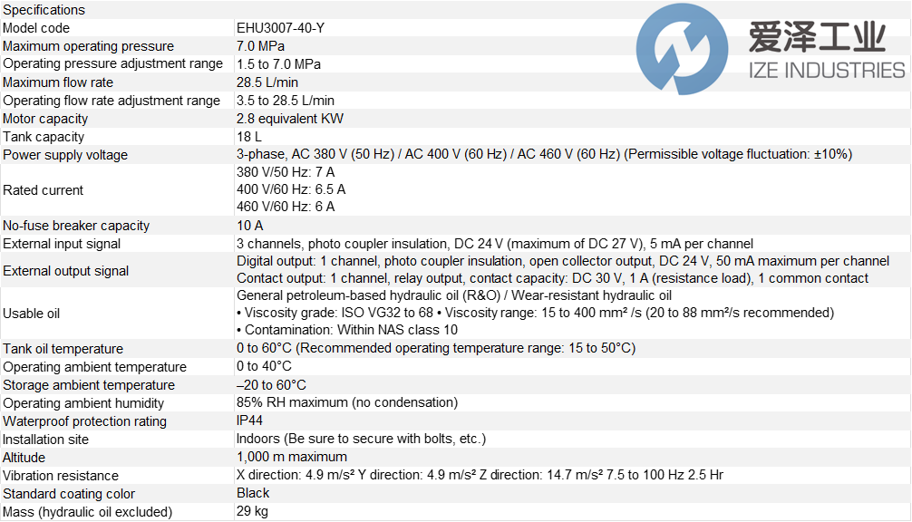 DAIKIN液压动力单元ECORICH系列EHU3007-40-Y技术参数及介绍