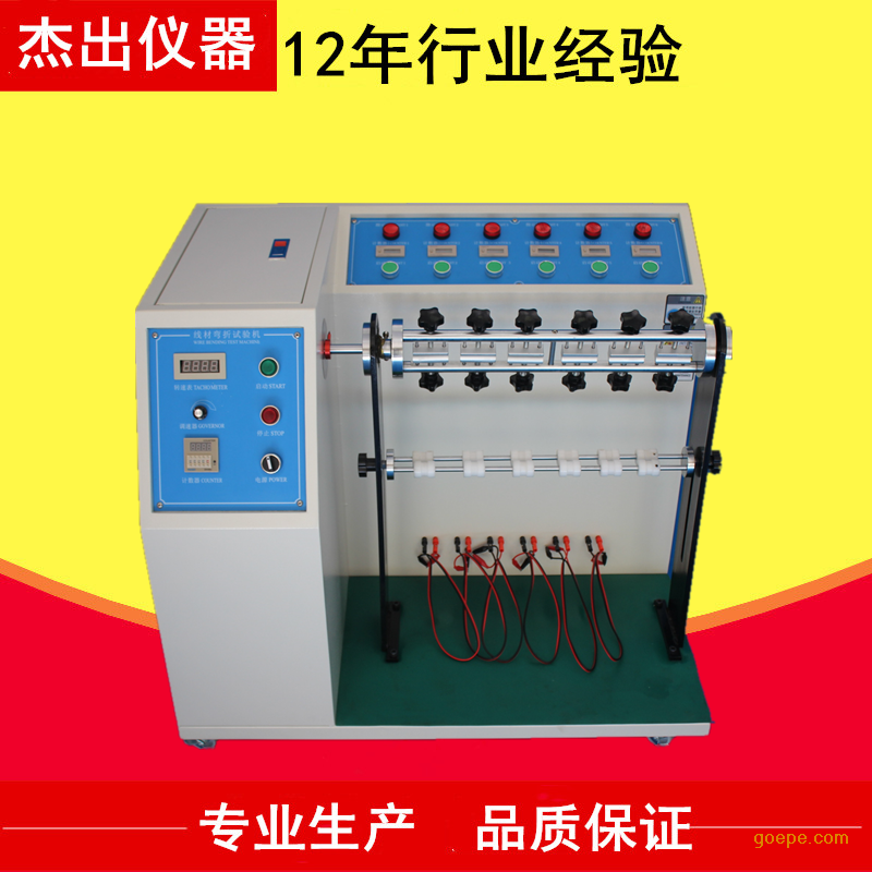 试验方法:试法是将试料固定在夹具上,并加上一定荷重,夹具左右摇摆,经一定次数后,检查其断线率,或至无法通电时,查看其总计数次数,能自动停止工作;