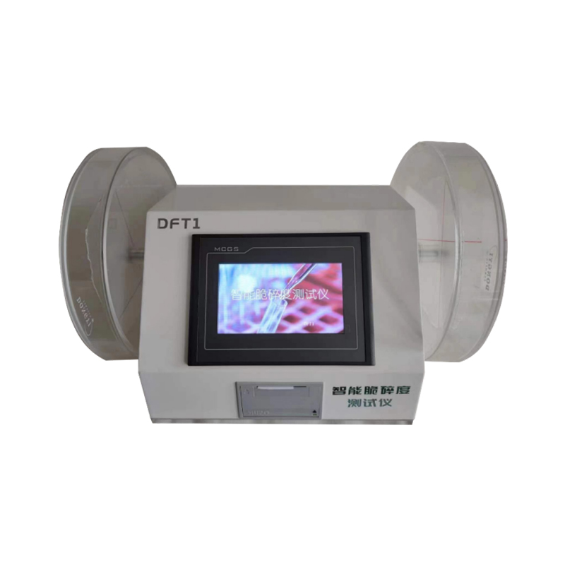 DFT1型智能脆碎度测试仪采用大尺寸内置操作系统的触摸显示屏对仪器进行控制。整机简洁美观,操作简便,使用可靠。电机通过齿形带与传动轴联接,传动轴左右两侧各装有一支检测轮毂,轮毂转动时,毂内样品在挡板作用下不断翻滚、滑动并从轴心掉落至毂壁或在其前面掉落的其它样片上。经规定次数(或时间)后,取出样品观察并精密称重,经计算判断样品是否合格。