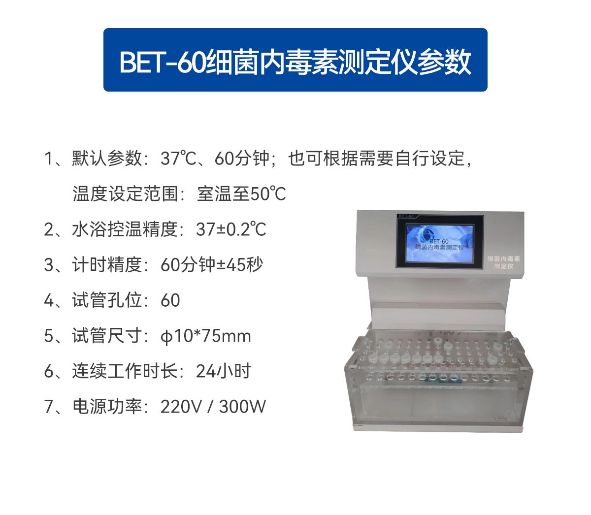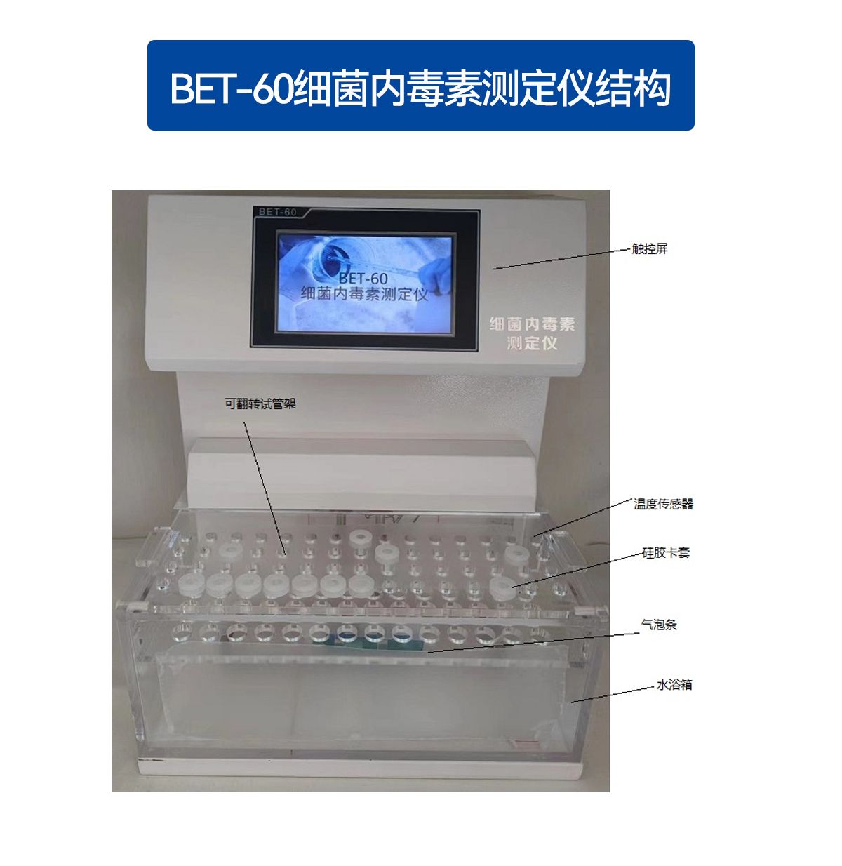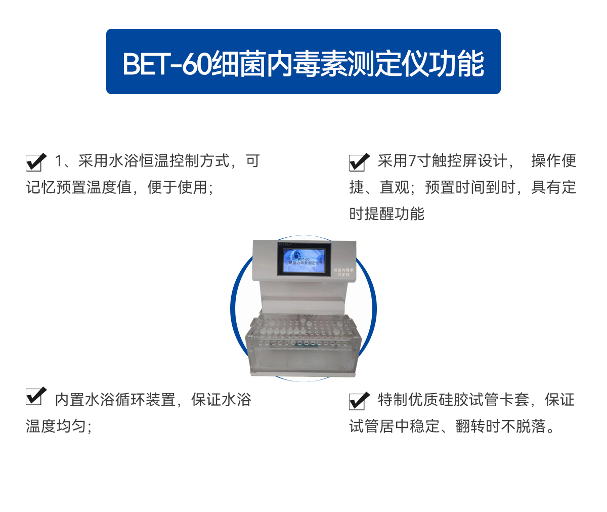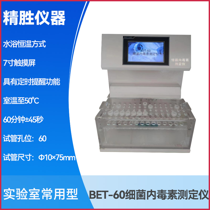 BET-60型细菌内毒素测定仪根据中国药典“细菌内毒素检查法”,以凝胶法为依据,采用水浴恒温方式、7寸触摸屏、具有定时提醒功能。