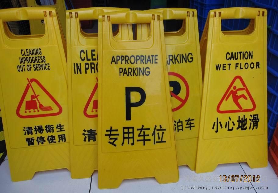 塑料告示牌: 塑料告示牌一般采用全新优质塑料注塑成型,外观光洁平整,精美厚实,稳重大方。产品不老化变形,高温暴晒及低温严寒的情况下使用,一样历久如新。警示牌与锥体结合紧密牢固,图案及字样清晰,配有中英字体,款式多种多样。