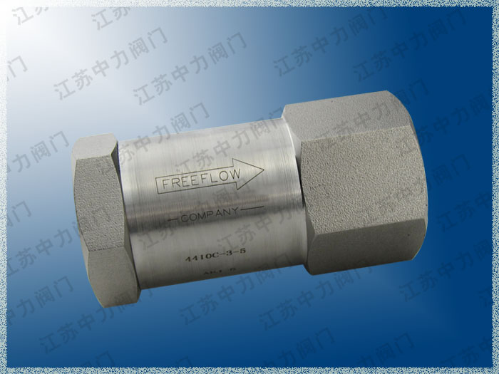 主要承压件均经详细的强度校核,使用安全可靠。超高压止回阀正常处于关闭状态,由于管线中进口端介质的压力作用,而克服弹簧阻力使阀门开启。当进口端介质压力低于出口端时,弹簧将阀芯推向阀芯而使阀门关闭,阻止介质逆流,起止回作用。