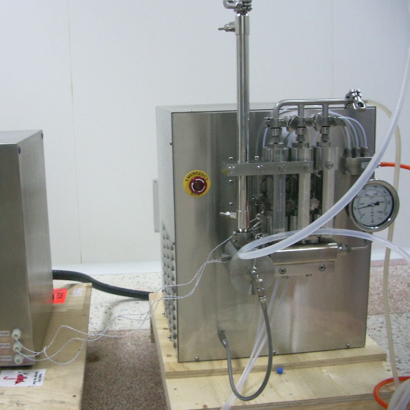脂质体:在15000Psi(1000Bar)下均质,在通过过滤挤出器(经过聚碳酸酯膜),也可以均质+挤出,可制备出50nm、100nm、200nm以下的脂质体, 您也可以选择零损耗1毫升