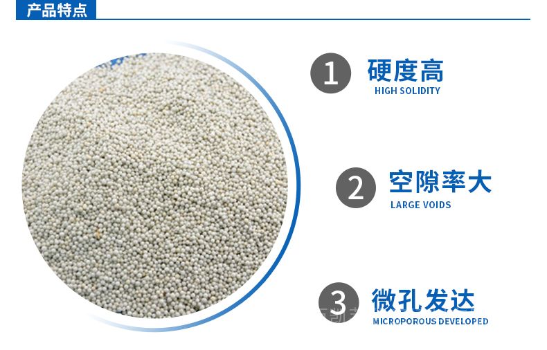 瓷砂滤料也被称为稀土瓷砂滤料,广泛用于单层滤池、多层滤池、机械过滤器中做过滤介质。其原材料采用好的高岭土、粘结剂、成孔剂,经高温烧制成外观白色,质地坚硬,颗粒均匀,微孔发达,空隙率大,圆度饱满的新型滤料,是石英砂、无烟煤等传统滤料的升级换代产品,能满足各种成份复杂的工业废水和城市污水的深度处理。