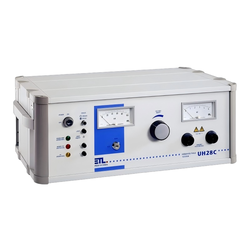 ETL UH28CS是一款高压测试仪,可提供 200–12000V AC 的测试电压,测试电流限制在 0.5-50mA,功率超过 600VA,短路电流大于 200mA(符合 EN 61180 标准),且具有电位隔离特性,适合配合测试手枪进行测试(符合 EN 50191 标准)。
