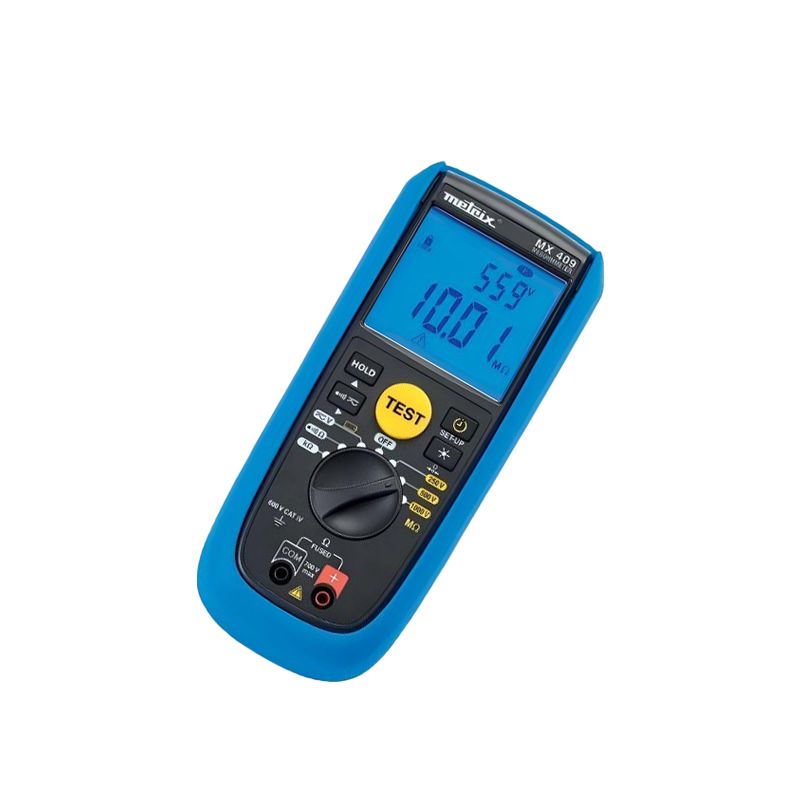 MX409是一款绝缘测试仪兼万用表,符合多项适用标准(如 IEC 61557、IEC 61010-1 等),具备 600V CAT IV 的电气安全等级和 IP40 防护等级。其设计注重易用性与安全性,配备大屏幕双色背光显示屏,可同时显示绝缘值和实际测试电压,还带有防震外壳、可折叠支架及内置颈带,方便手持或免提使用,自动关机功能有助于延长电池寿命。