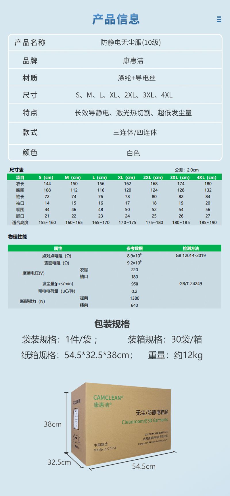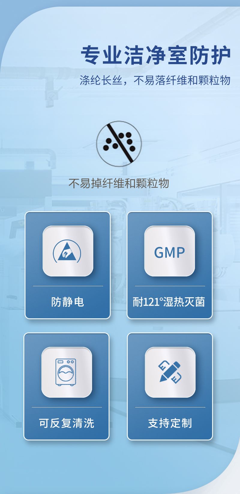 :有大褂、分体服、连帽分体服、三连体服、分式四连体服等多种款式,还可根据特定行业需求定制特殊款式,以满足不同洁净室和工作场景的需求。