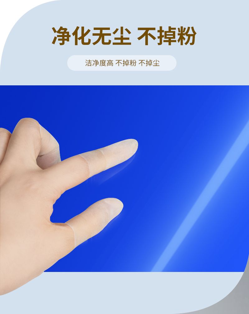 物理性能上,它的扯断伸长率≥750%、拉伸强度≥24MPa,具备出色的弹性与抗撕裂能力,在复杂操作中不易破损,可有效防止手部直接接触造成的污染,为精密元器件筑牢防护屏障。洁净性能同样突出,表面无粉,经蓝膜按压无明显痕迹,符合高洁净场景的使用标准。