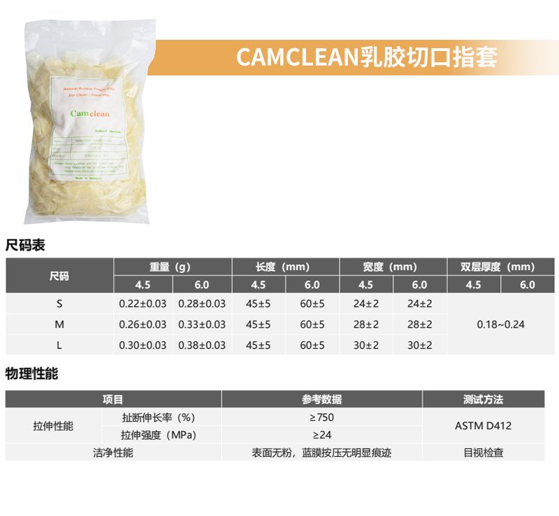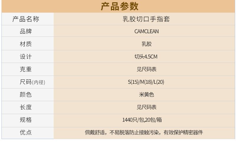 该公司的乳胶切口手指套以乳胶为核心材质,采用 4.5CM 切头设计,切口边缘平整顺滑,既保证了佩戴时的贴合度,又避免了多余胶料影响操作灵活性。它提供 S、M、L 三种尺码选择,内径分别为 15mm、18mm、20mm,对应宽度从 24mm 到 30mm 不等,搭配 45±5mm 的切口长度与 60±5mm 的整体长度,。在重量与厚度上,不同尺码也有精细区分,实现了防护性与灵活性的平衡,佩戴时舒适不勒手,长时间操作也不易产生疲劳感。