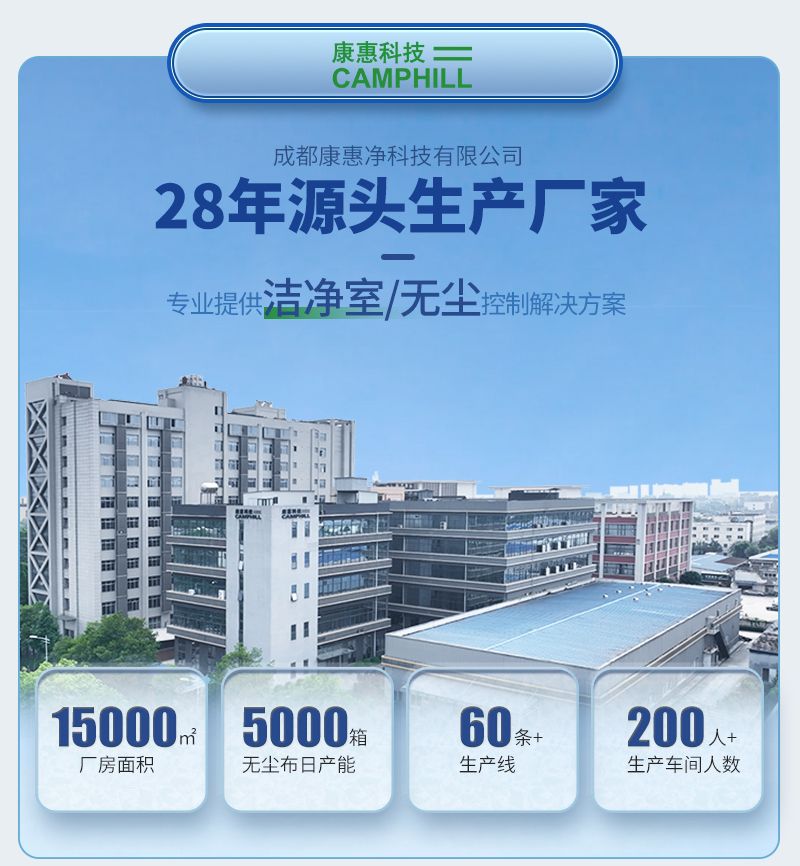 重庆康惠科技生产用地面积超 4000 平方米,建设有十级到十万级洁净车间;配备4层楼车间。公司主营防静电无尘服、无尘布、条帽、口罩、一次性手套、清洗及各类 PPE 防护产品。聚焦洁净、防静电防护领域,为半导体、汽车电子、YL、食品等高端制造行业提供一站式防护解决方案。
