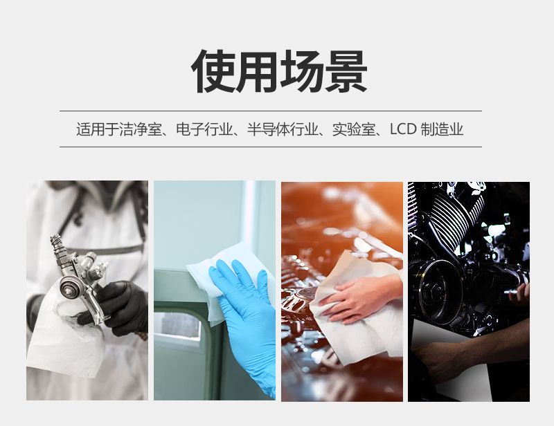 该产品适用场地广泛,可用于 1000 级至 10000 级洁净室日常清洁,在电子元器件、半导体、光电产品生产及检测环节表现出色,也适用于精密仪器、光学镜片、显示屏的精细擦拭,同时满足实验室器皿清洁、精密模具维护等对无尘、无损伤清洁有严格要求的工业场景。