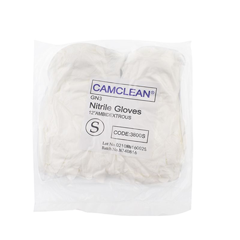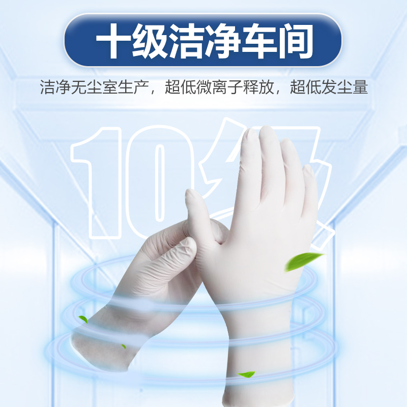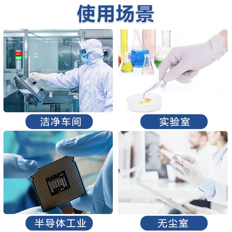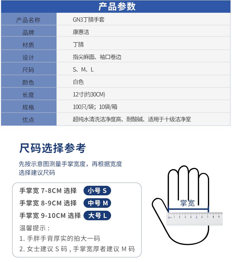 康惠洁 GN3 丁腈手套,以丁腈为材质,采用指尖麻面、袖口卷边设计,有 S、M、L 三个尺码,颜色为白色,长度达 12 寸(约 30CM),每盒 100 只、每箱 10 盒。它经超纯水清洗,洁净度高,耐酸碱,适用于十级洁净室。在物理性能上,其针孔接收水平为 AQL 1.50,物理尺寸及力学性能等接收水平为 AQL 4.0,老化前伸长率 701%、扯断强力 17.0 MPa,老化后仍保持 638% 的伸长率和 14.8 MPa 的扯断强力;LPC 水平为 362 pcs/cm²(≥0.5μm),离子含量极低,K⁺、Na⁺ 仅 0.011 μg/cm²,CL⁻ 为 0.499 μg/cm²,SO₄²⁻ 为 0.073 μg/cm²,各项指标均通过 ISO 及 IEST 标准检测。