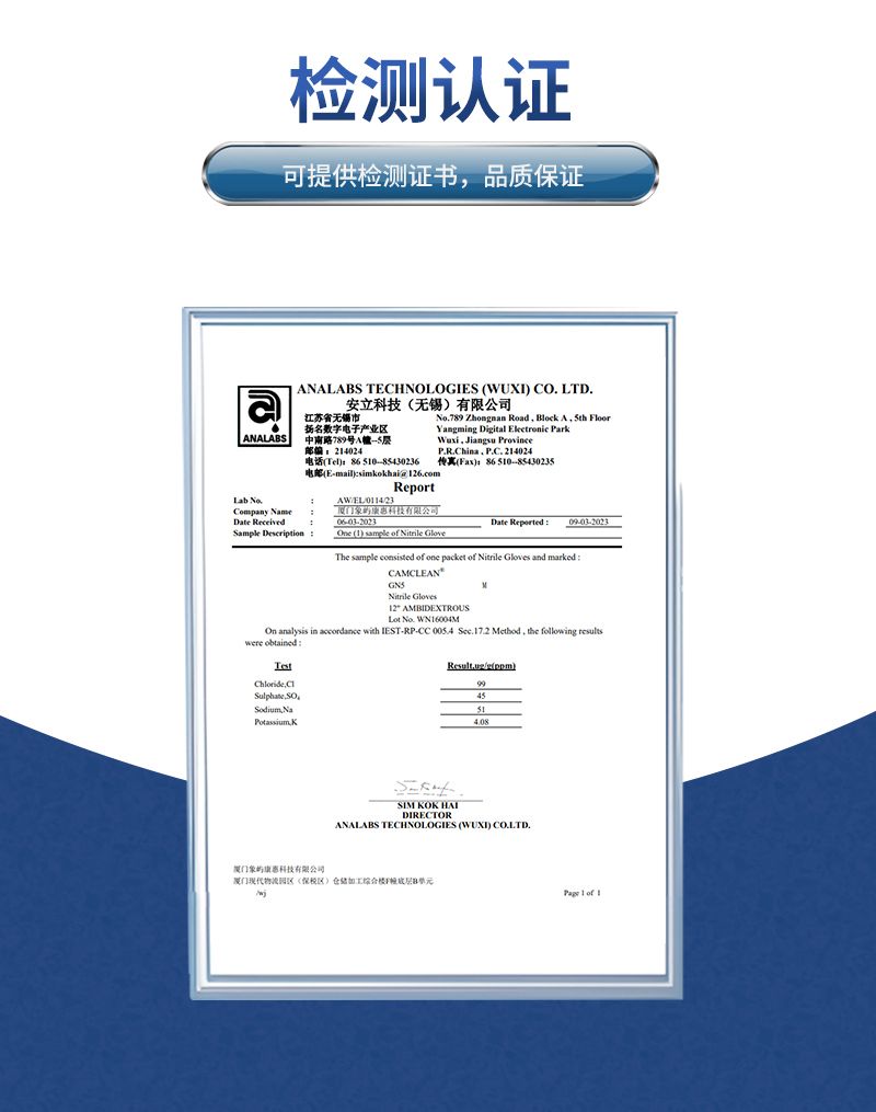康惠洁 GN3 丁腈手套专为高洁净场景设计,采用超纯水清洗工艺,LPC 值与离子析出量极低,满足十级洁净室严苛标准,可有效避免污染精密产品。丁腈材质具备优异的耐酸碱、耐溶剂性能,老化前后均保持出色的拉伸强度与伸长率,耐用不易破损。指尖麻面设计提升抓握稳定性,兼顾防护与舒适,且不含乳胶蛋白,杜绝过敏风险。全项指标通过 ISO、IEST 权威认证,是电子半导体、制药、实验室等领域的安心之选。
