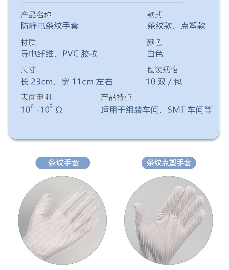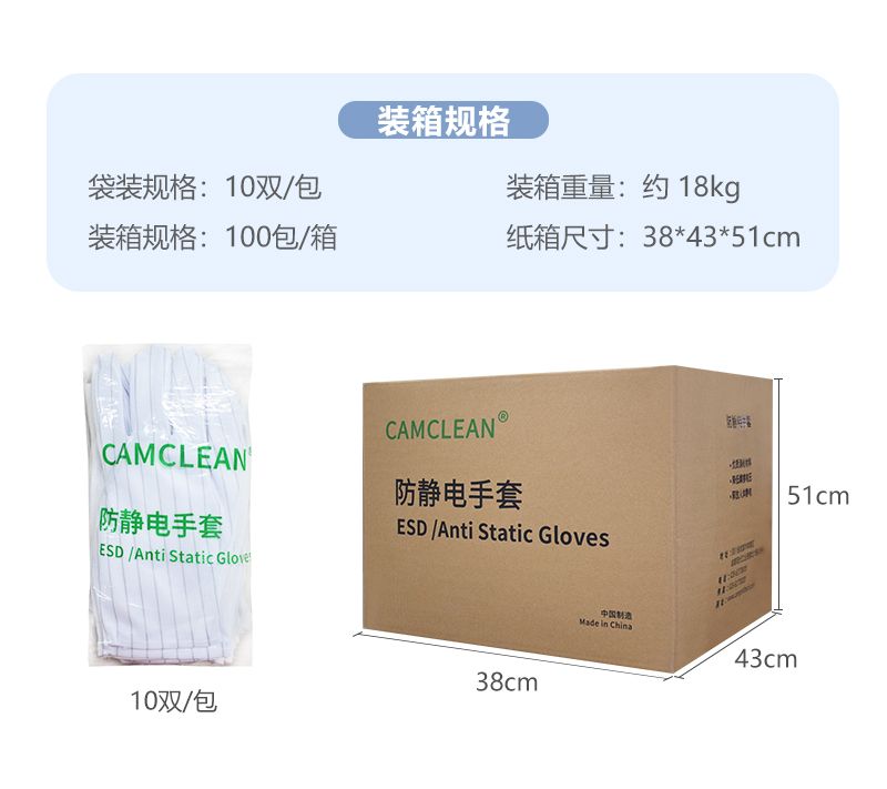 CAMCLEAN® 防静电条纹手套,由涤纶纤维和含碳纤维导电丝制成,分为条纹款和点塑款两种设计,均为白色均码,采用长纤涤纶丝针织布料,具备透气透湿性高、穿戴舒适、发尘率低的特点。产品包装为 10 双 / 包,100 包 / 箱,条纹款和点塑款的尺寸均为 210±10mm,宽度为 89~97mm。物理性能其点对点电阻为 6.55×10⁶Ω(依据 GB/T22845 标准检测),摩擦电压为 189V(依据 ANSI/ESD S20.20 标准检测)。