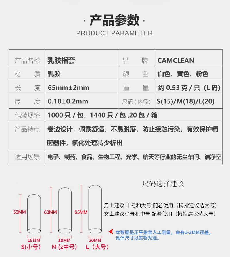 康惠洁CAMCLEAN 乳胶指套以天然乳胶为原料,有 S、M、L三种尺码可选,颜色包含三种颜色,厚度为 0.1±0.02mm。该产品有 1000 只 / 包和 1440 只 / 包(20 包 / 箱)两种包装规格,表面无粉,经氯化处理减少析出,蓝膜按压无明显痕迹,可有效保护精密器件,其拉伸性能优异,扯断伸长率≥750%、拉伸强度≥24MPa(依据测试),洁净性能通过目视检查验证,适用于电子、制药、食品、生物工程、光学、航天等行业的无尘车间与洁净室。