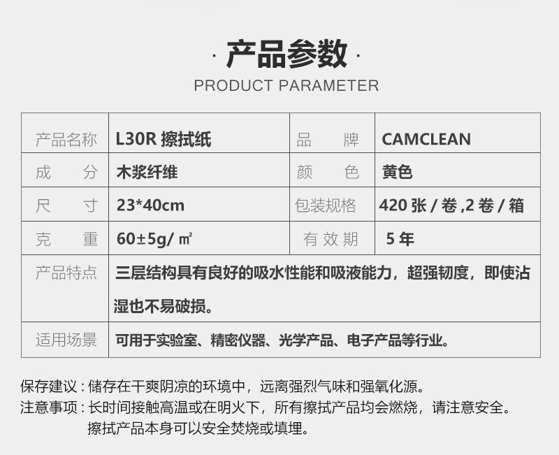 康惠洁L30R擦拭纸,以木浆纤维为原料,呈黄色,单张尺寸为 23x40cm,每卷 420 张,每箱 2 卷,有效期 5 年。它采用三层结构,兼具优异的吸水吸液能力与超强韧度,沾湿后也不易破损,适用于无尘车间、实验室、精密仪器、光学产品及电子产品等场景。该擦拭纸厚度为 0.3mm,干态横向断裂强力 20.3N、纵向断裂强力 55.2N,干态横向断裂伸长率 14%,水分吸收能力为 2.2g/1010cm,吸水速率达 67.5mm/100s。保存时需置注意避免长时间接触高温或明火。