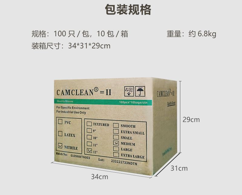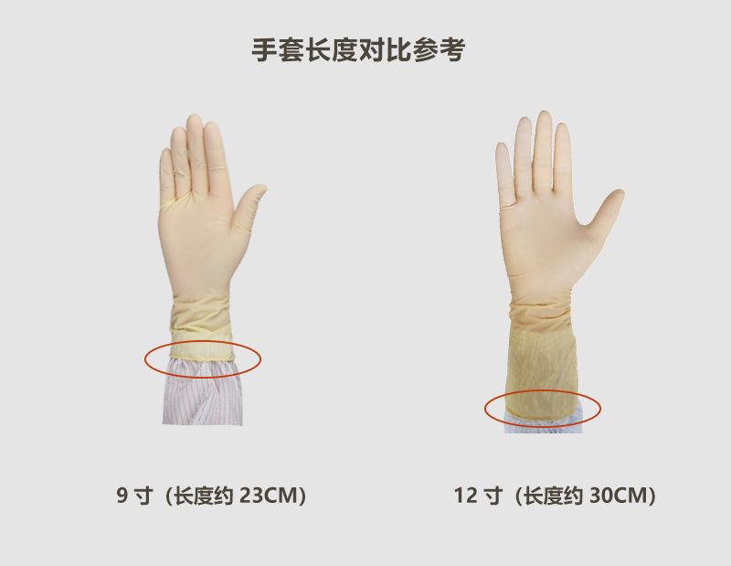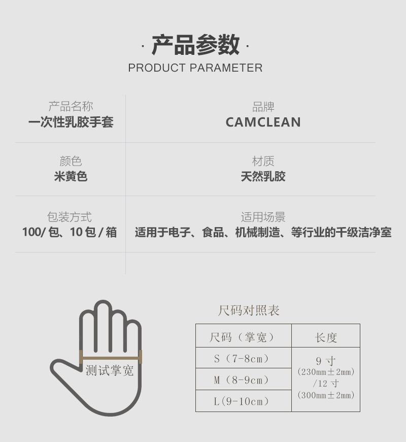 S、M、L 三个尺码可选,长度分为 9 寸和 12 寸两种,每包 100 只,每箱 10 包。这款手套弹性好、贴合性佳,其物理性能水平为:针孔 1.50,物理尺寸、扯断力和扯断伸长率、外观的接收水平均为 4.0;拉伸性能老化前伸长率