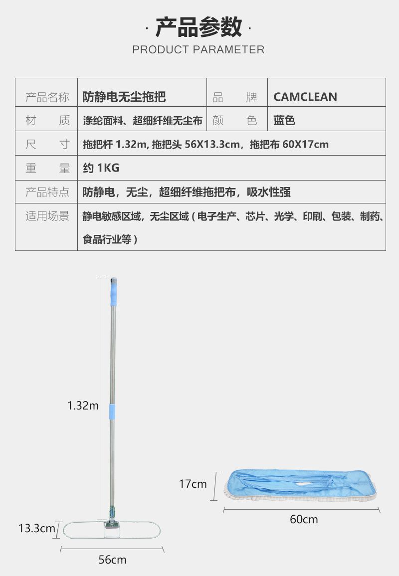 1KG,采用涤纶面料和超细纤维无尘布材质;尺寸规格为拖把杆 1.32m,拖把头 56×13.3cm,拖布巾 60×17cm,具备防静电、无尘的特点,且超细纤维拖把布吸水性强,适用于静电敏感区域与无尘区域,如电子生产、芯片、光学、印刷、包装、制药、食品行业等场景。