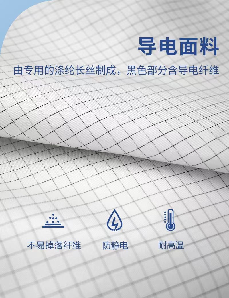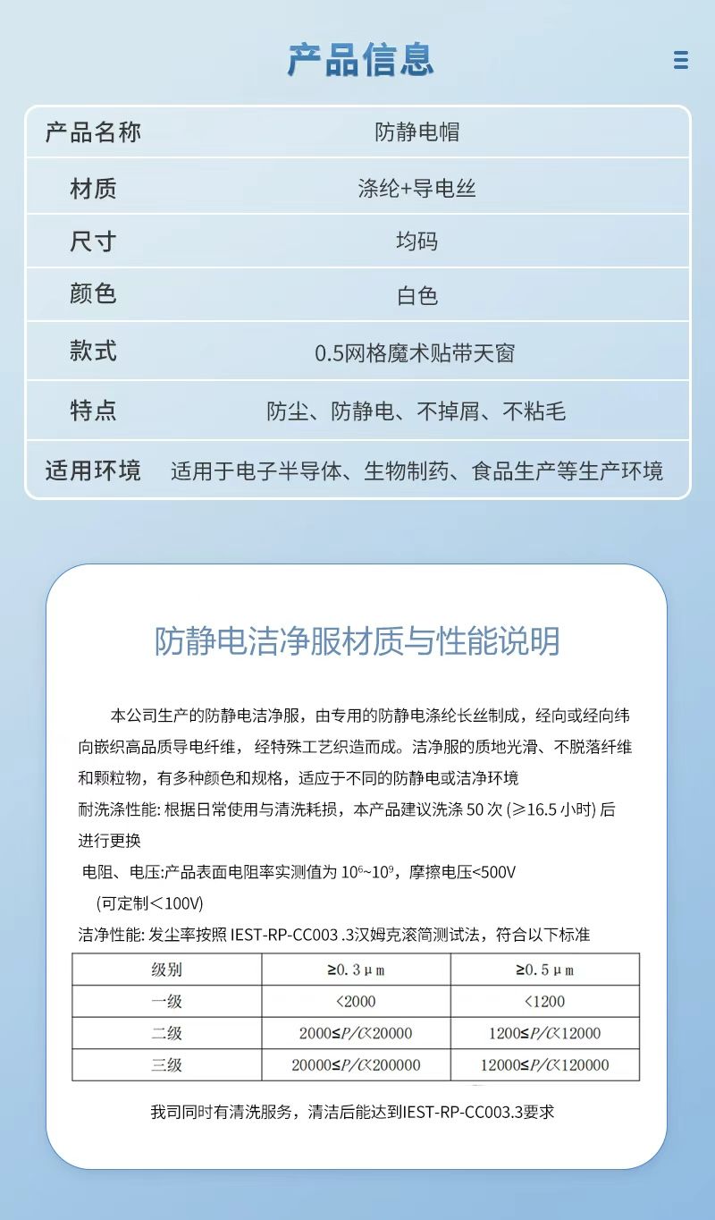 + 导电丝材质,均码白色 0.5 网格魔术贴带天窗款式,具备防尘、防静电、不掉屑、不粘毛特性,适用于电子半导体、生物制药、食品生产等洁净环境。配套防静电洁净服由防静电涤纶长丝编织导电纤维制成,表面电阻率 10⁶~10⁹,摩擦电压 < 500V(可定制 < 100V),洁净性能符合 IEST-RP-CC003.3 标准,建议洗涤 50 次后更换,我司提供无尘类清洗服务