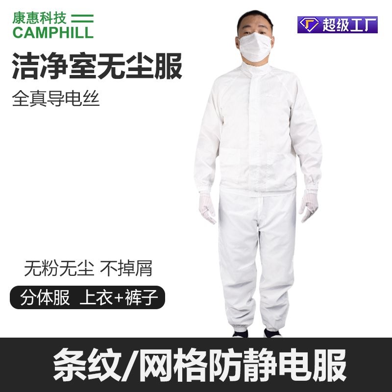 康惠洁防静电防尘服采用分体式设计,主体材质为防静电涤纶,经特殊工艺织造而成