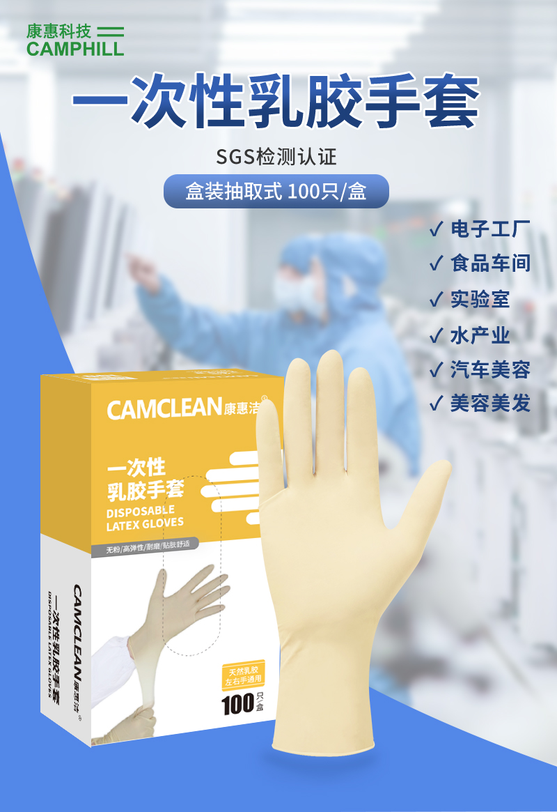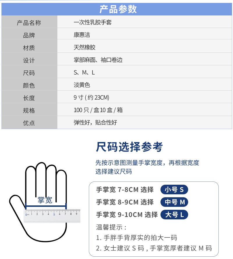 康惠洁一次性乳胶手套,采用天然橡胶材质,掌部麻面、袖口卷边设计,有