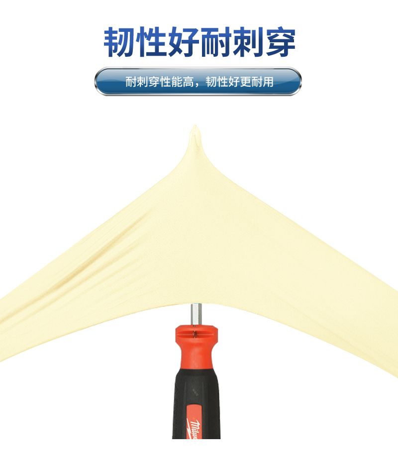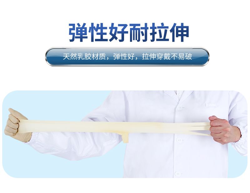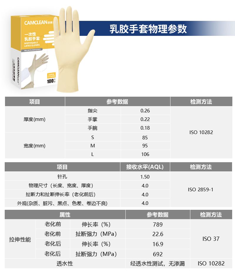 S、M、L 三种尺码可选,颜色为淡黄色,长度 9 寸(约 23CM),规格为 100 只 / 盒、10 盒 / 箱,具备弹性好、贴合性好的优点;其厚度在指尖为 0.26mm、手掌 0.22mm、手腕 0.18mm,不同尺码宽度分别为 S 码 85mm、M 码 95mm、L 码 106mm;质量标准方面,针孔接收水平 AQL 为 1.50,物理尺寸、扯断力和扯断伸长率(老化前后)、外观等项目的 AQL 均为 4.0;拉伸性能表现为老化前伸长率 789%、扯断强力 22.6MPa,老化后伸长率 16.9%、扯断强力 692MPa,且经透水性测试无渗漏。