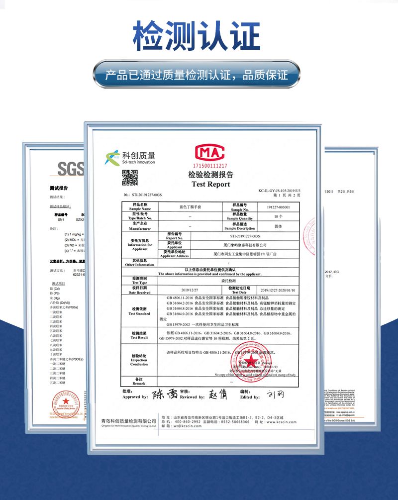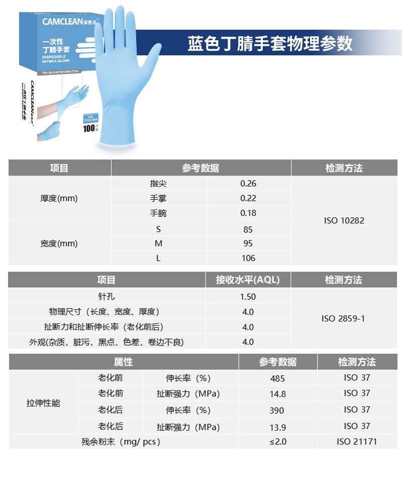 0.26mm、手掌 0.22mm、手腕 0.18mm,不同尺码宽度分别为 S 码 85mm、M 码 95mm、L 码 106mm;质量标准方面,针孔接收水平 AQL 为 1.50,物理尺寸、扯断力和扯断伸长率、外观等项目 AQL 均为 4.0;拉伸性能表现优异,老化前伸长率 485%、扯断强力 14.8MPa,老化后伸长率 390%、扯断强力 13.9MPa,残余粉末≤2.0mg /