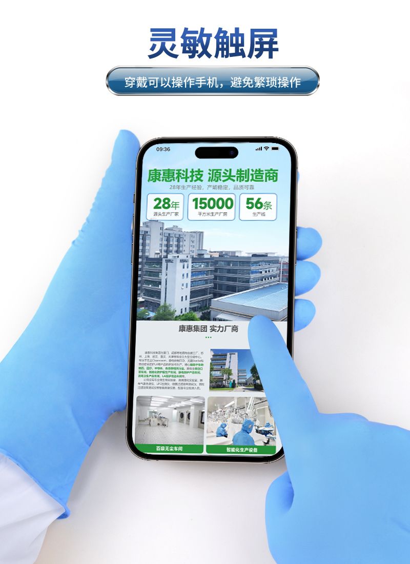 康惠洁一次性蓝色丁腈手套,采用天然橡胶材质,兼具天然防静电与耐酸碱性能,掌部麻面,袖口卷边。手套为浅蓝色,长度