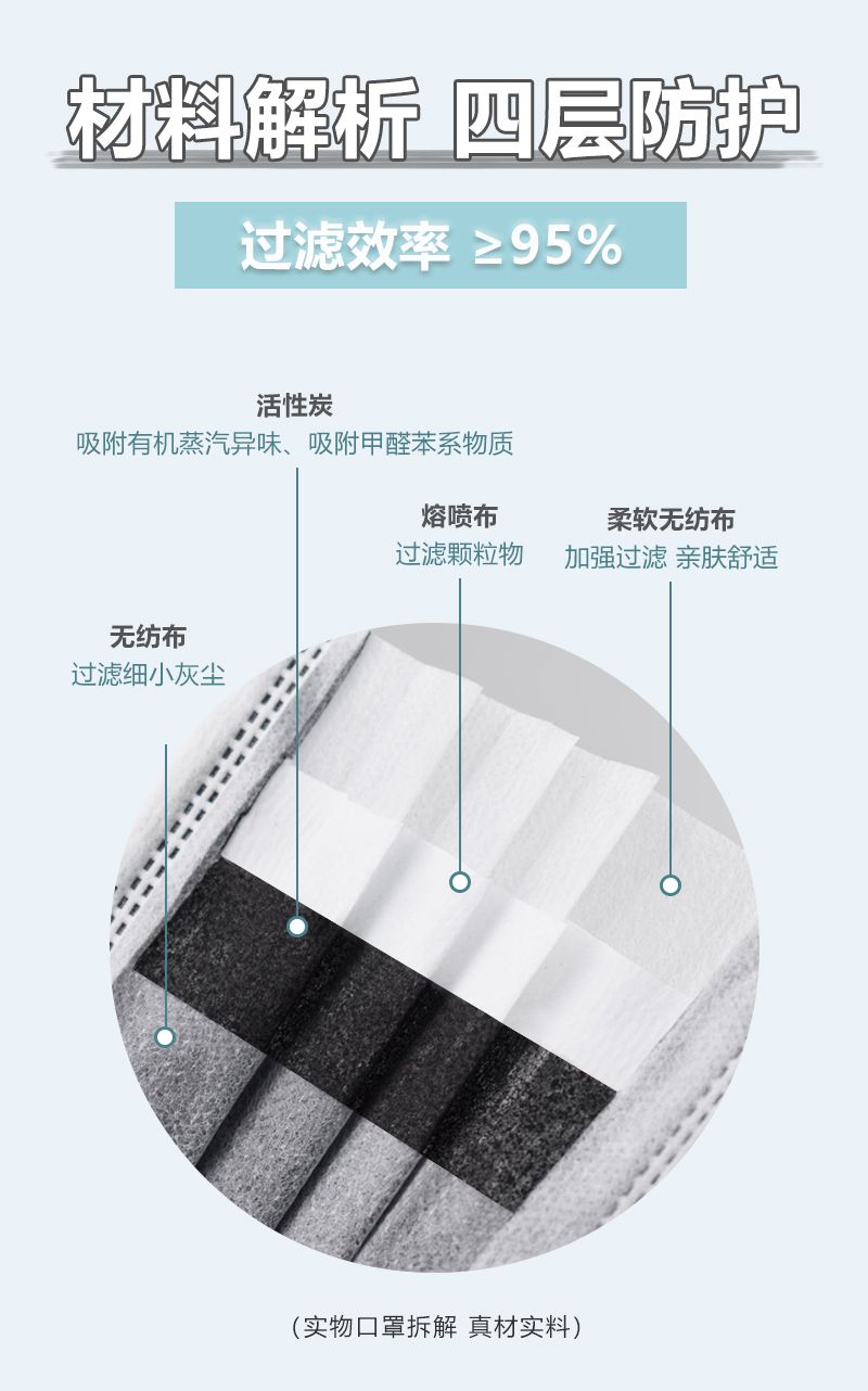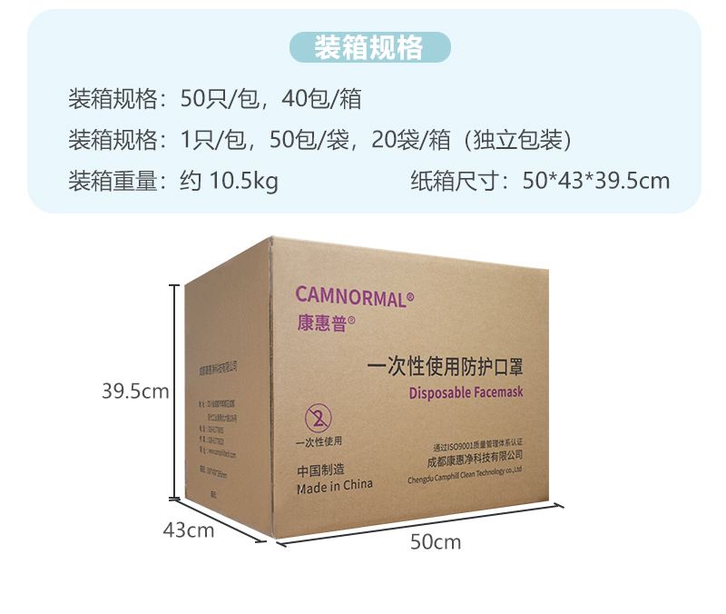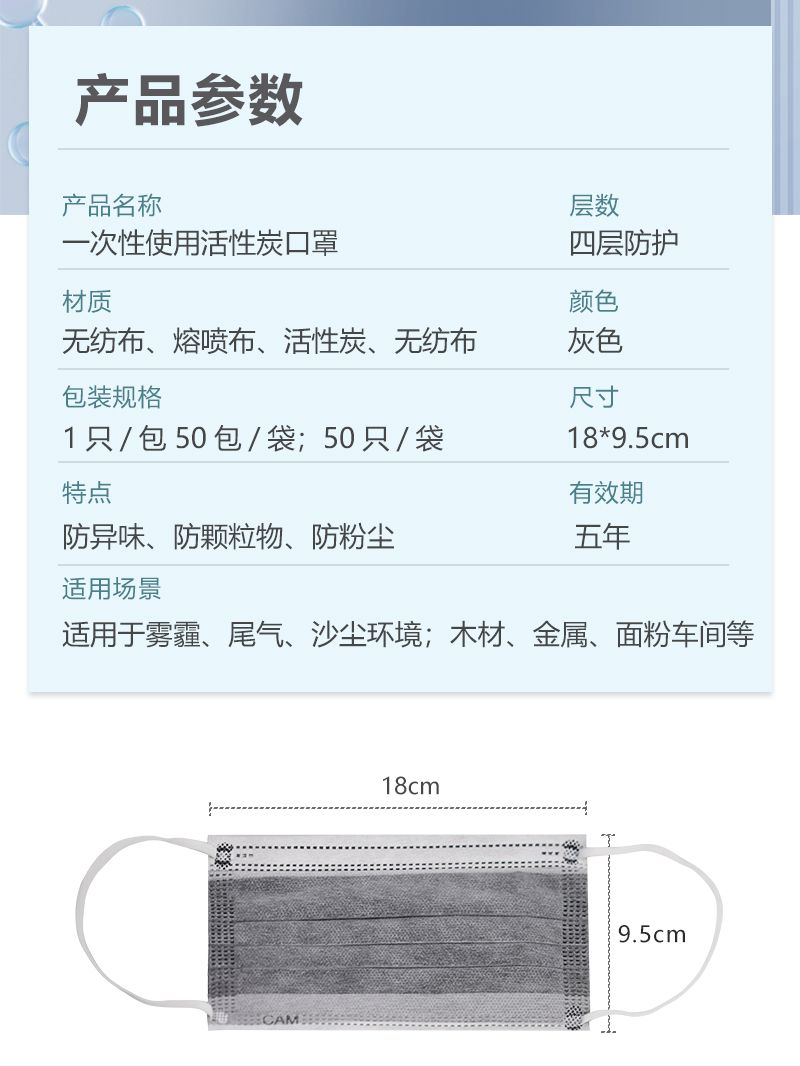 康惠科技重庆工厂生产用地面积超4000平方米,建设有百级到十万级洁净车间;配备4层楼车间。公司主营防静电无尘服、无尘布、条帽、口罩、一次性手套、清洗及各类 PPE 防护产品。聚焦洁净、防静电防护领域,为半导体、汽车电子、YL、食品等高端制造行业提供一站式防护解决方案。 康惠普一次性使用活性炭口罩,采用无纺布、熔喷布、活性炭、无纺布多层材质,尺码为18x9.5CM,灰色外观,有效期长达5年。产品规格有1只/包(50包/袋)和50只/袋两种可选,适用于雾霾、尾气、沙尘等恶劣环境,以及木材、金属、面粉车间等工业场景。装箱规格为40包/箱或20包/箱(独立包装),整箱重量约10.5kg,纸箱尺寸为50x43x39.5cm。 适用于雾霾、尾气、沙尘等户外恶劣环境,也可用于木材、金属、面粉车间等工业粉尘作业场景,能有效过滤粉尘、异味与颗粒物,满足日常防护与工业防护需求。