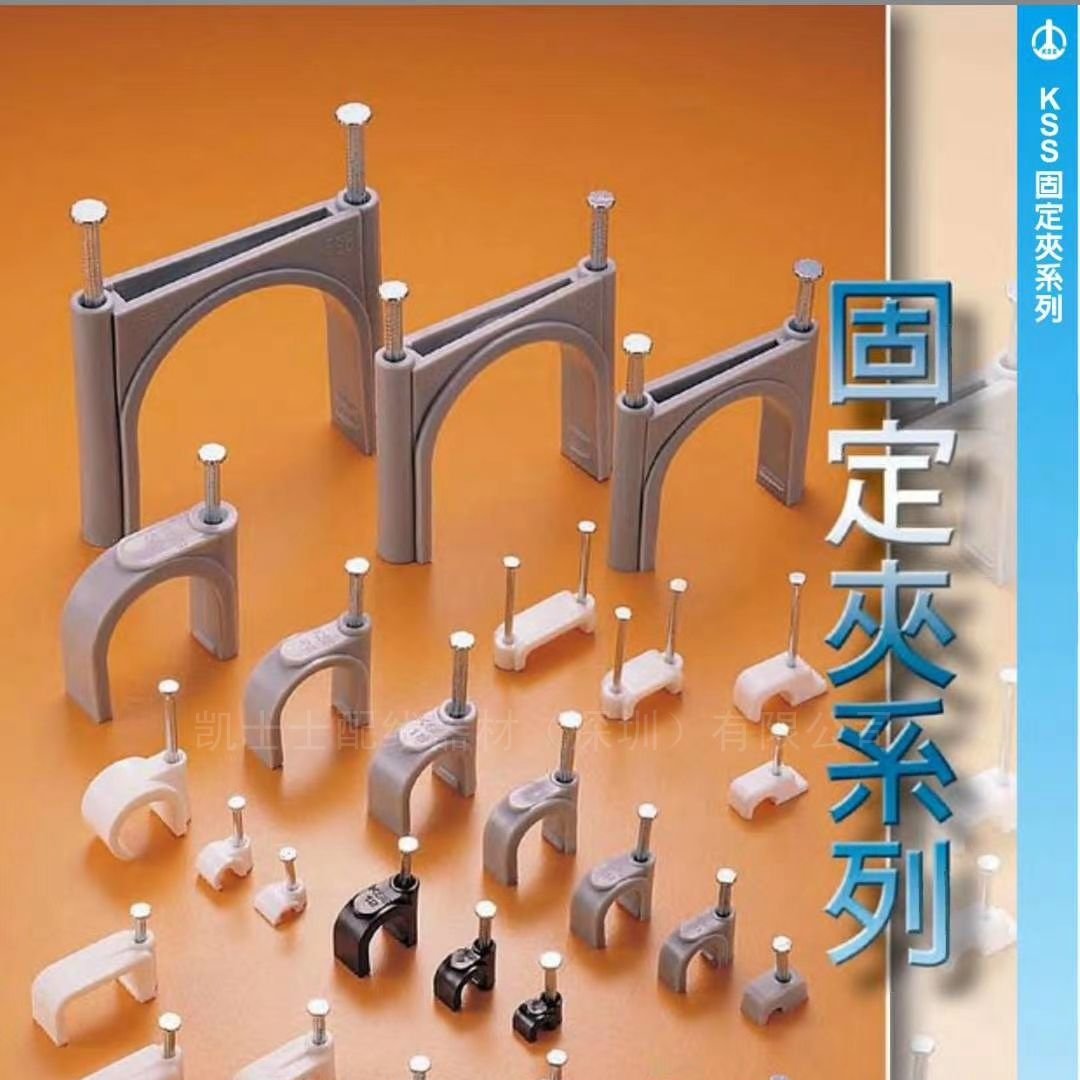 固定夹产品包括:电话线固定夹、扁线固定夹、插钉式电缆固定夹、电缆线固定夹、钩型电缆固定夹、双钉式扁线固定夹、双钉式电缆固定夹、被覆铜管固定夹、针型壁虎等。