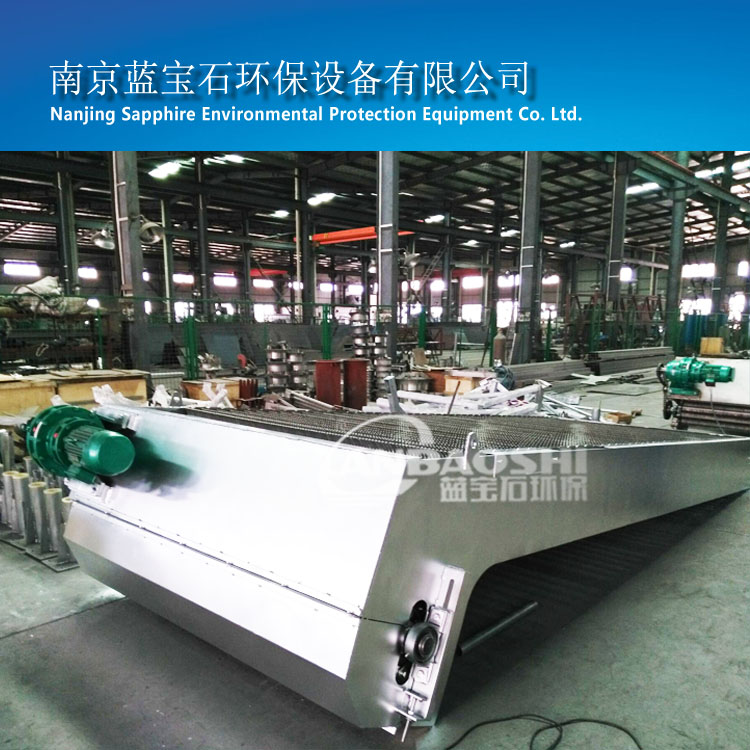 (3) 链条采用特制的宽链板不锈钢链条,链条的安全系数不小于6,并设有链轮张紧调节装置。在链槽中运转时,不需增加其他阻渣装置,即可有效防止栅渣缠入链槽,避免卡阻现象。