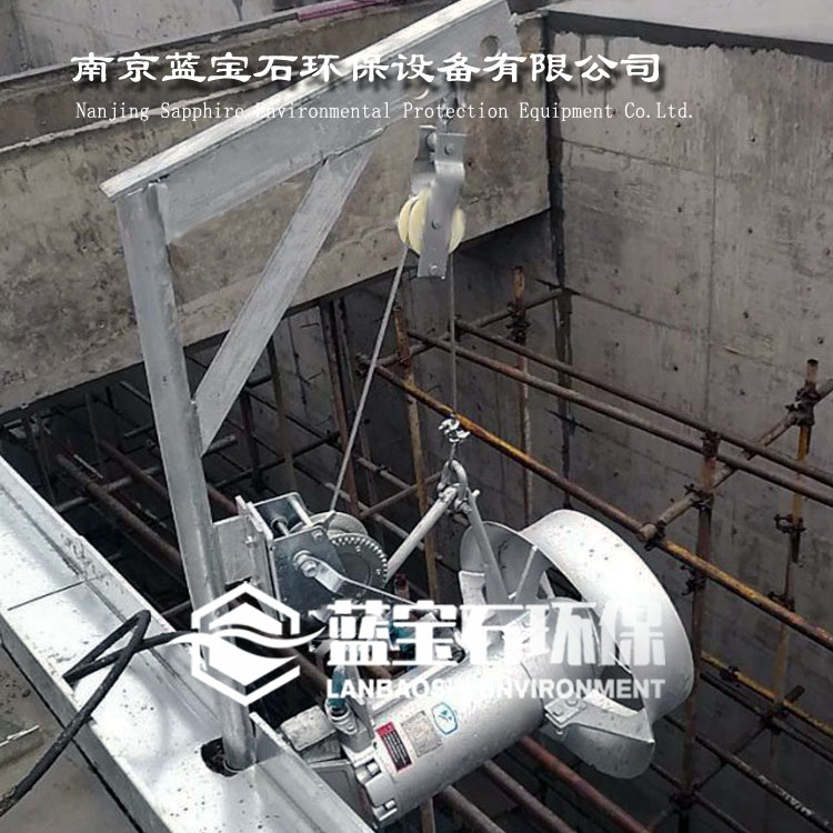 QJB型铸件式潜水搅拌机主要由潜水电机、密封机构、叶轮、导流罩、手摇葫芦、安装系统、电气控制等部分构成。搅拌叶轮在电机驱动下旋转搅拌液体,使之产生旋向射流,并利用沿着射流表面的剪切应力来进行混合,使流场以外的液体通过摩擦产生搅拌作用,在极度混合的同时,形成体积流,应用大体积流动模式得到受控流体的输送。