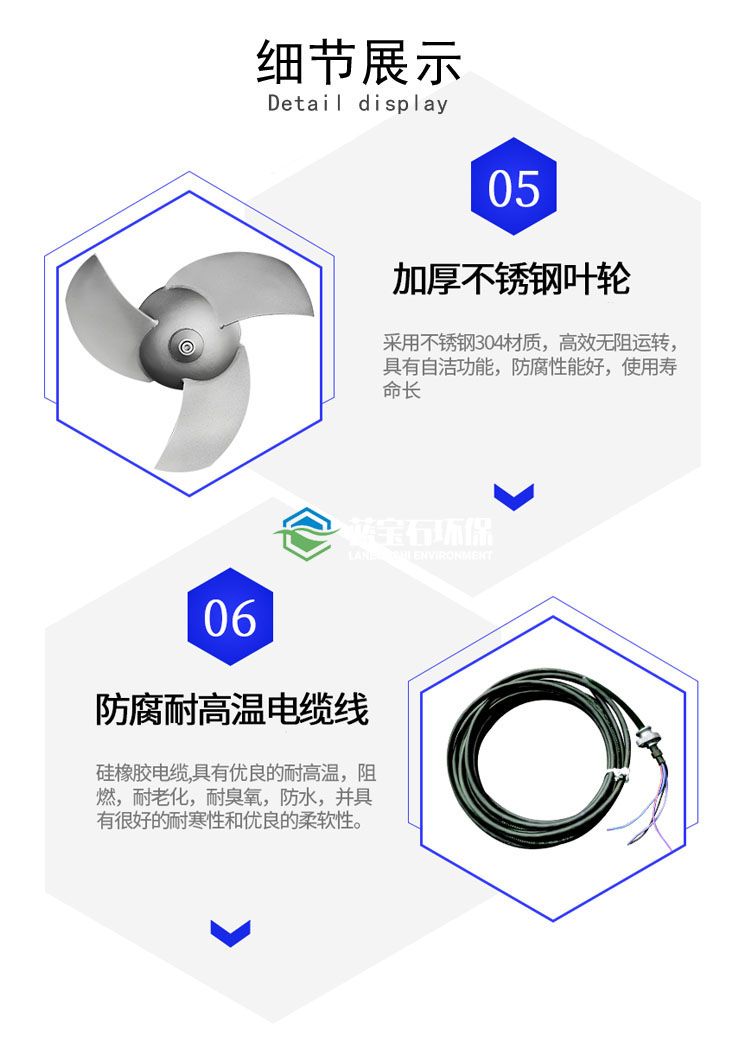 立式式搅拌机由电机、减速机、机架、搅拌轴、桨板、联轴器、水下支座等组成。根据密封方式可分为:A型:带有机械密封,B型:不带密封,C型:其它密封方式,可适用于不同密封要求的场合。 驱动装置采用普通电机或防爆电机、摆线针轮减速机,驱动装置主轴通过联轴器与搅拌轴联接,搅拌轴由轴承支承,具有足够的强度和较高的稳定性。 搅拌机桨叶采用45度折叶桨,可产生轴向、径向和环向分流,使物料与水快速充分混合,满足工艺要求。