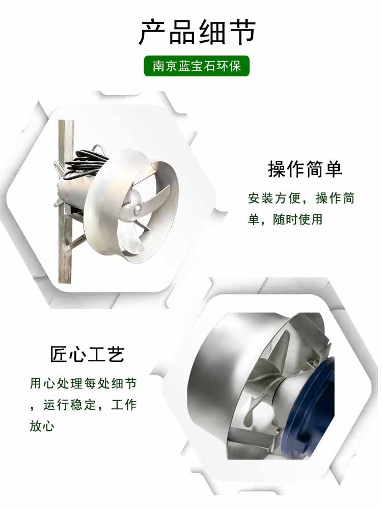 低速推流系列产品采用摆线针轮减速机,配备功率小,转速低,叶轮直径大,服务面积广。叶轮由聚胺脂材料和铝合金铸成,强度高,耐腐蚀性强,除了具有搅拌的功能外还能外还兼有推流和创建水流的作用。