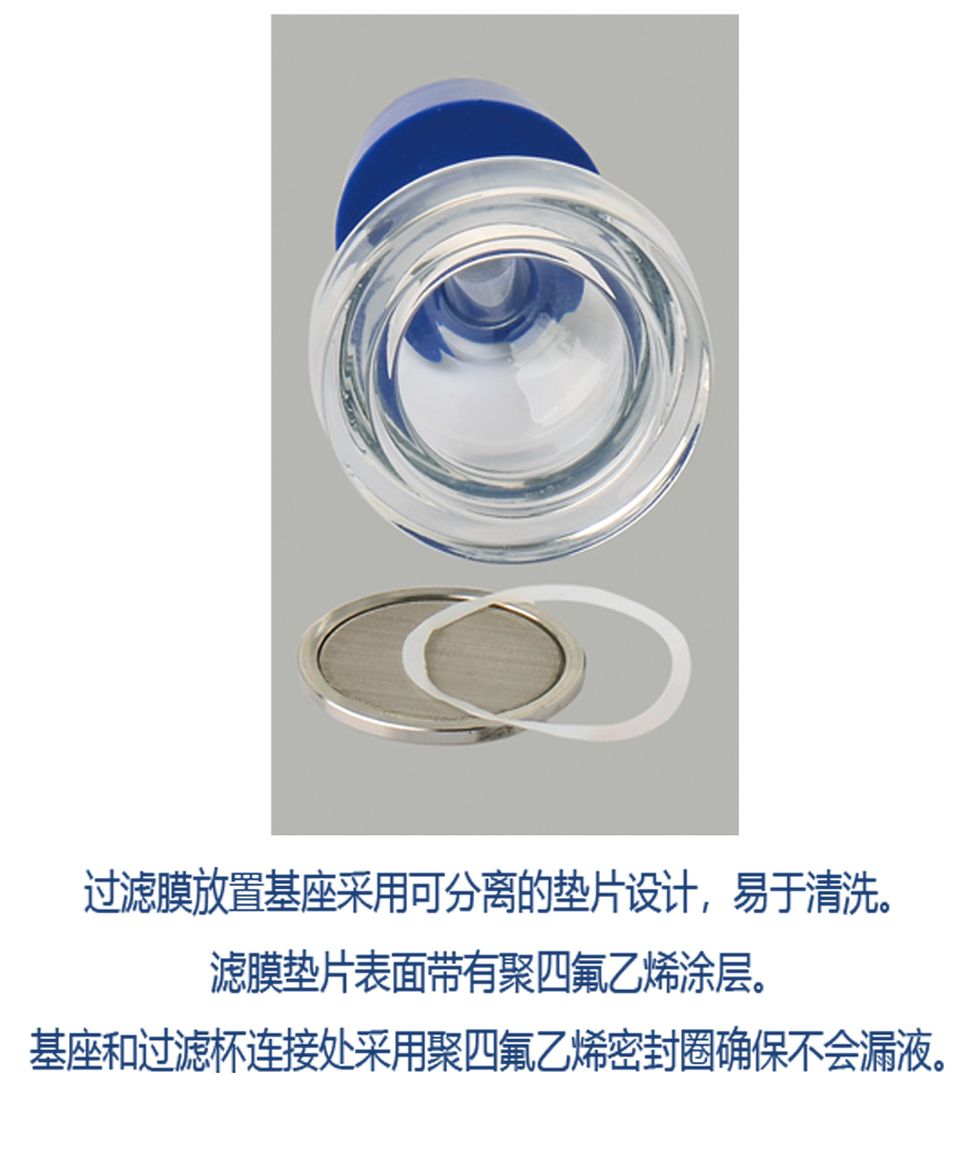 功能:可分离式滤膜垫片和基座、防倾倒底座、玻璃接口保护、防倒吸阻水