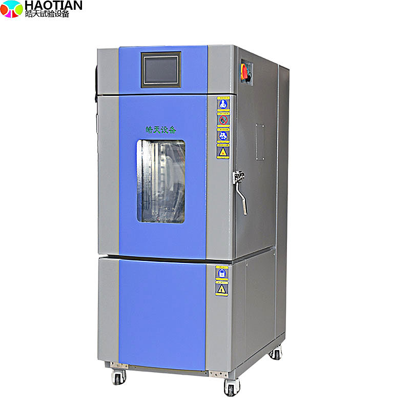 型观测视窗附照明灯保持箱内明亮,且采用双层玻璃,随时清晰的观测箱内状况。设有独立限温报警系统,超过限制温度即自动中断,保证实验安全运行不发生意外。台式恒温恒湿试验箱箱体左侧配直径50mm的测试孔,可供外接测试电源线或信号线使用。机器底部采用高品质可固定式PU活动轮。