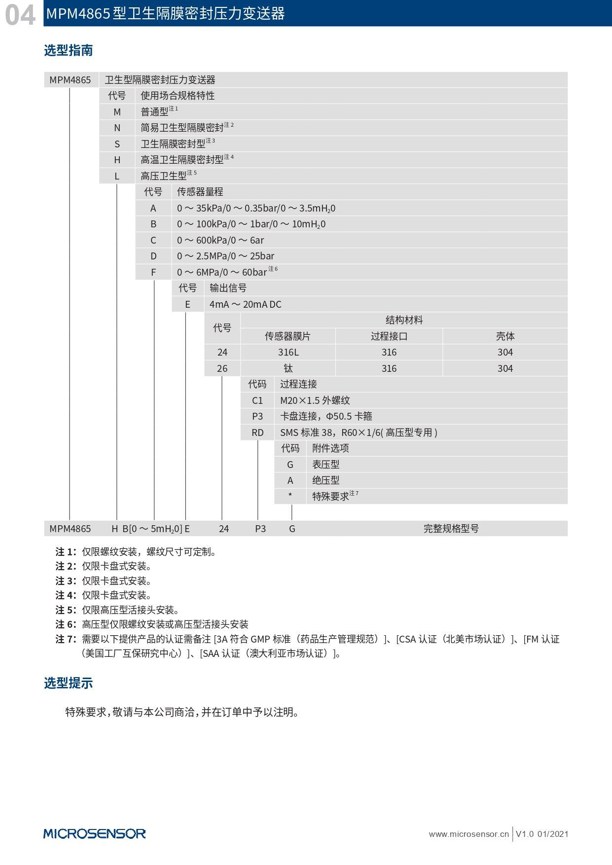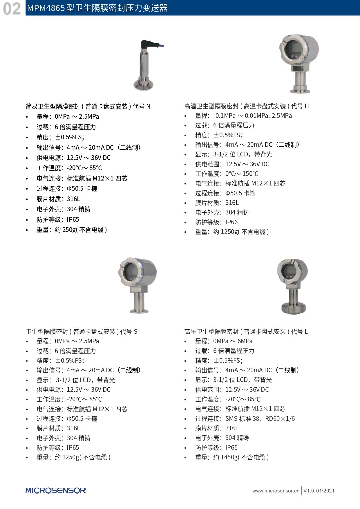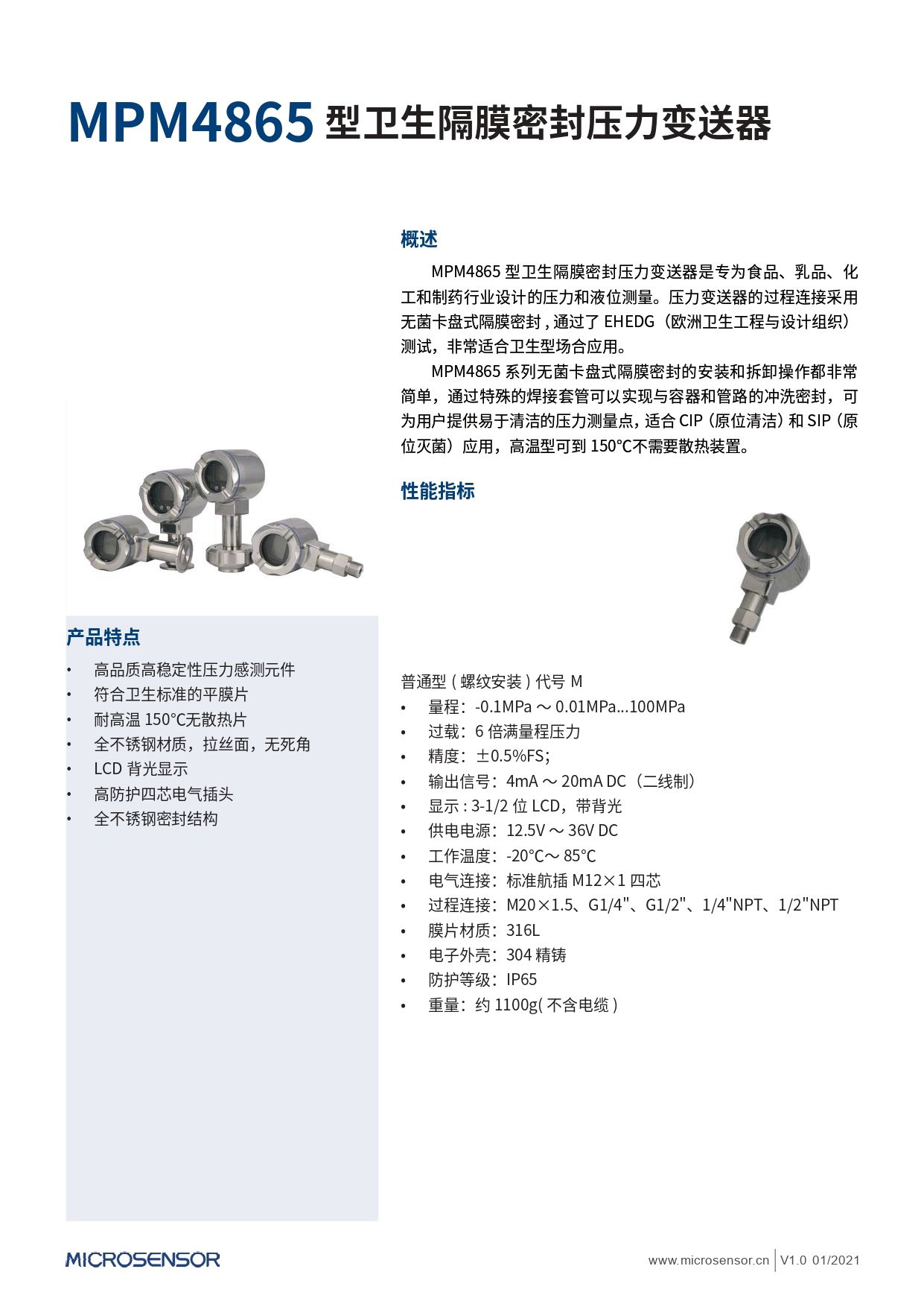 MPM4865型卫生隔膜密封压力变送器是专为食品、乳品、化工和制药行业设计的压力和液位测量。压力变送器的过程连接采用无菌卡盘式隔膜密封 , 通过了EHEDG(欧洲卫生工程与设计组织)测试,非常适合卫生型场合应用。