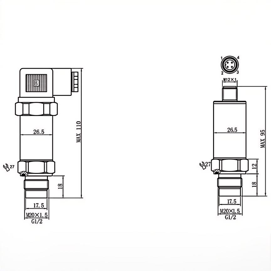 | 可选接口螺纹 | M20×1.5,M12×1,M10×1,1/4NPT, G1/2,G1/4 or as custom | 使用寿命 | 满量程100万次以上 |