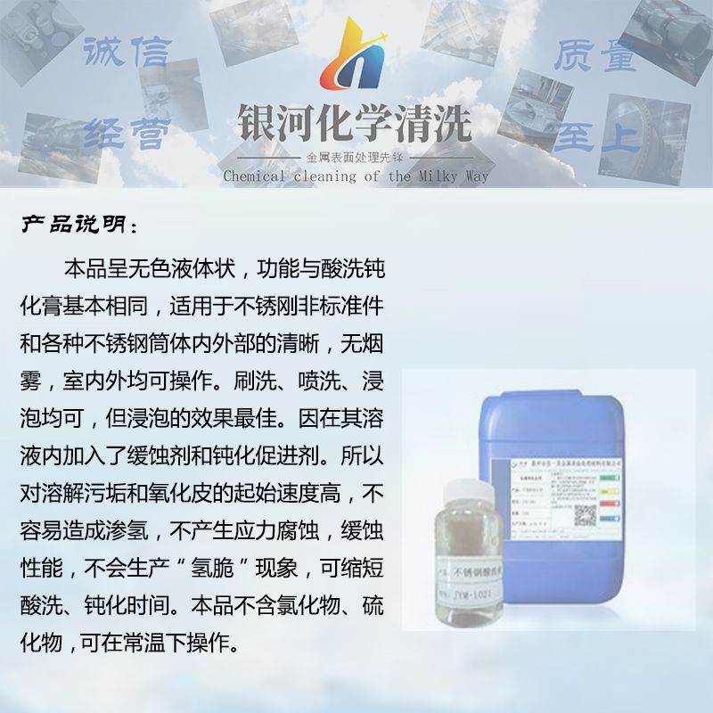 特点:无气味,室内外均可操作。刷洗、喷洗和浸泡均可,浸泡效果较好。操作工艺简单,施工方便,省时省力,经处理后的不锈钢表面光洁平滑,稳定性强,耐腐蚀性能明显提高,延长设备使寿命,提高产品附加值。