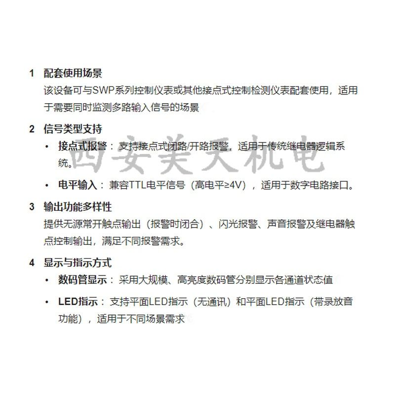 SWP-LED系列闪光报警控制仪可与各种SWP系列控制仪表或其他接点式控制检测仪表配套使用。可同时检测八路输入信号,八路信号均采用大规模、高亮度数码管分别显示各通道的当前状态值。
