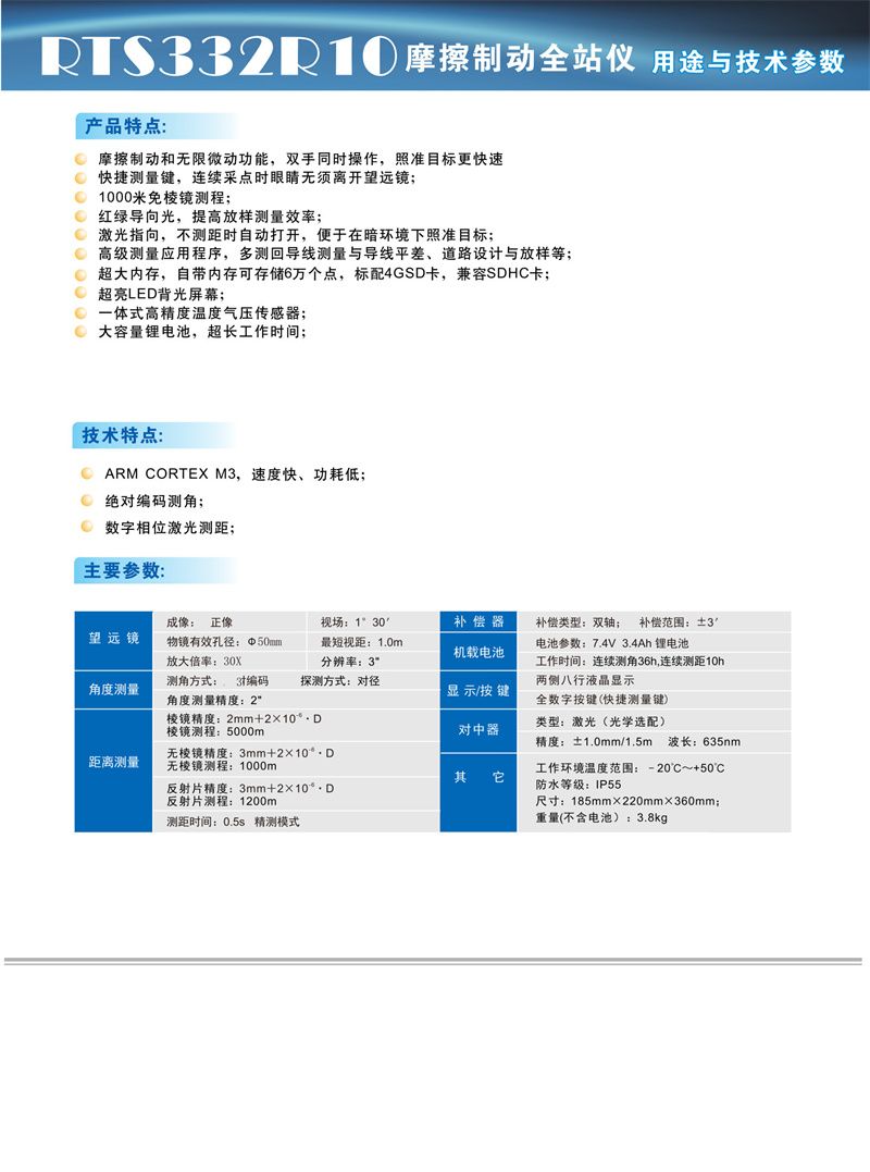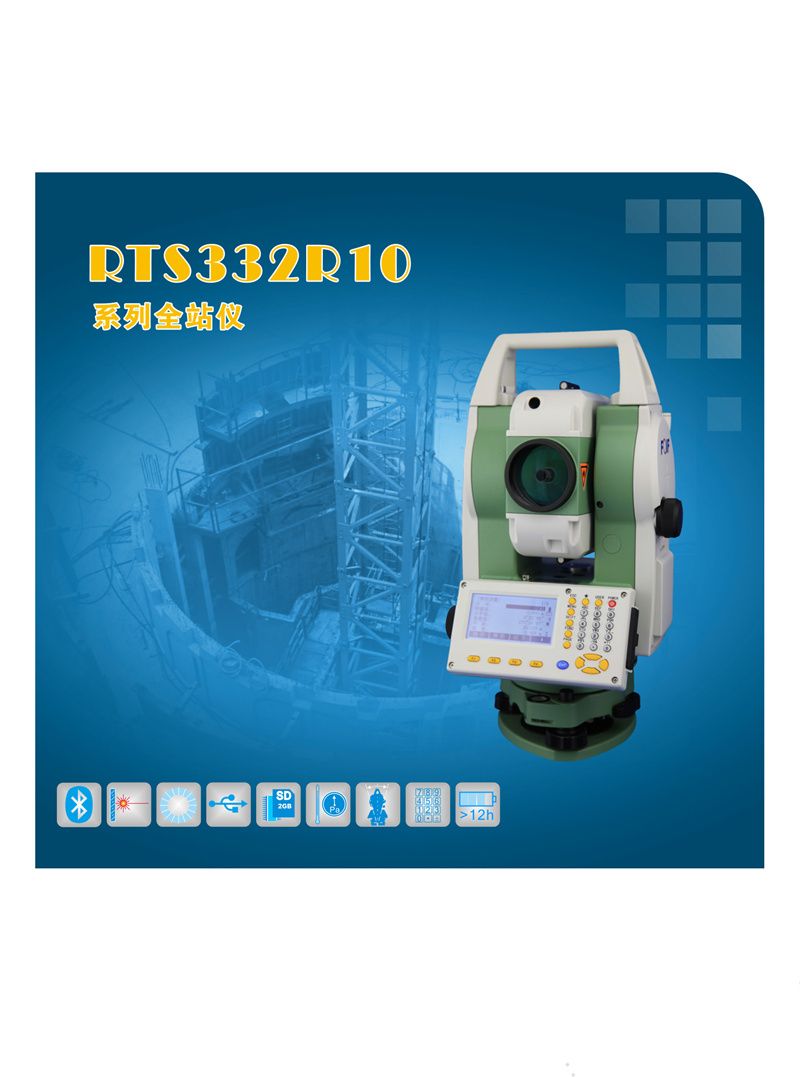 RTS330R10全站仪内置大容量内存和各种应用测量程序 ,功能强大、性能稳定、使用方便。适用于建筑放样、道路放样、地形地籍测量及控制点测设等测量工作。