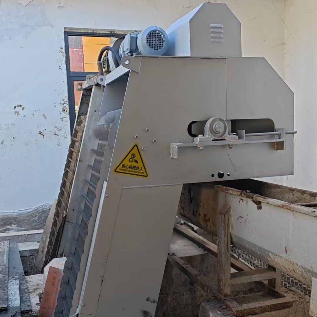 主要由驱动装置、机架、主轴、栅条、托渣板、齿耙及牵引链组成。在电机驱动下,通过减速机减速后,带动链轮与链条运动,固定在回转链条上除污齿耙链条在栅后运动到底部,经过导轮后翻转到栅前迎水面的位置,继续运动插入 固定栅条的间隙中上行,把栅前拦截的污物提升带出水面,并随着链条的运动到出渣口处自动翻转,污物自卸到格栅后的输送机或渣桶中,完成除污过程,液体则通 过栅条的栅隙流过,整个工作状态连续循环进行。