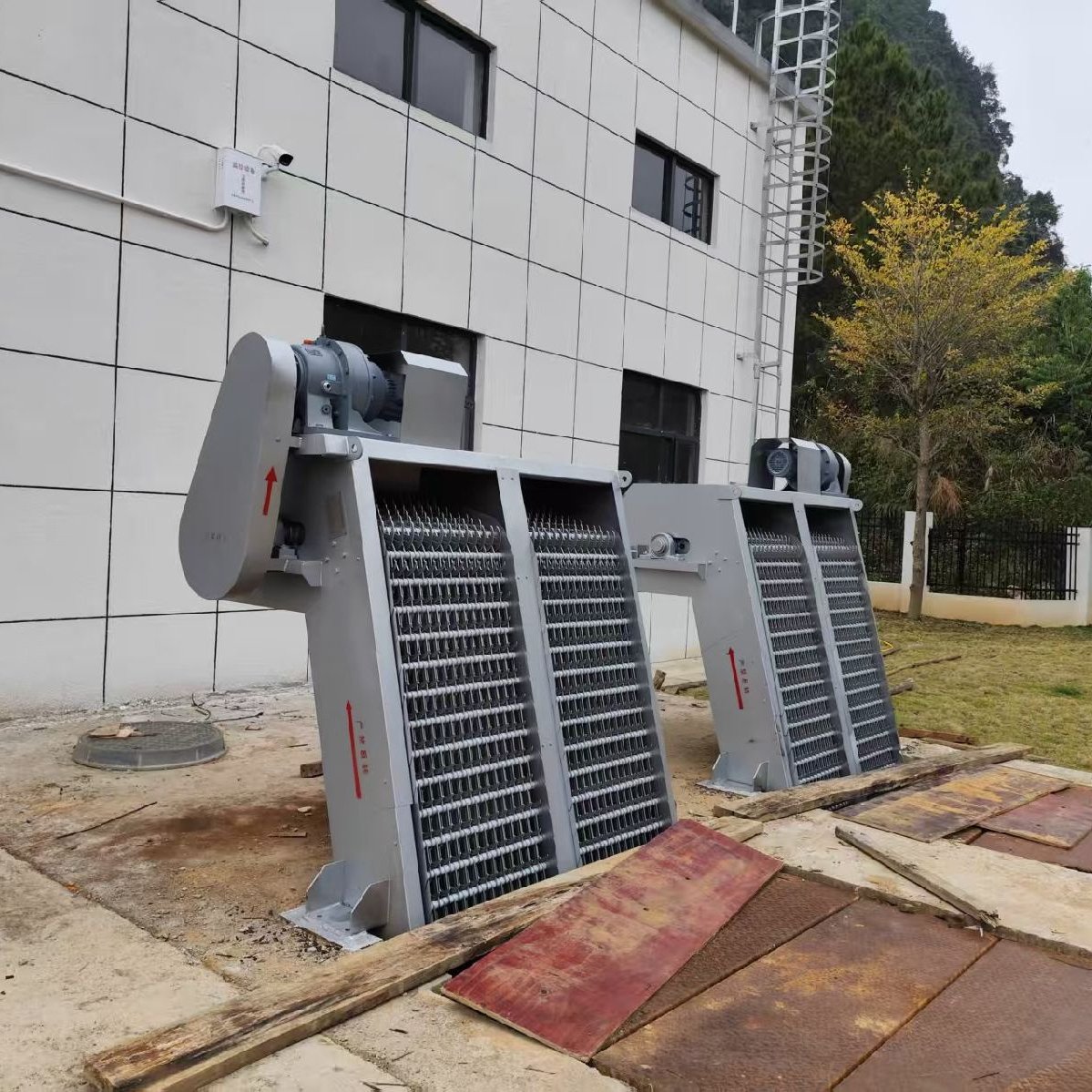 该设备是由ABS工程塑料、尼龙或不锈钢制成的耙齿,按排列次序装配在耙齿轴上,形成封闭式耙齿链,其下部安装在进渠水体中。当传动系统带动链轮作匀速定向旋转时,整个耙齿链便自上而下运动,并携带固体杂物从液体中分离出来,流体则通过耙齿的栅隙流过去,整个工作状态连续进行。由于耙齿的结构形状,使耙齿链携带杂物到达上端反向运动时前、后排耙齿之间产生相对自清运动,促使杂物依靠重力脱落。GSHZ回转式格栅机采用回转式,由一种犁形耙齿按装配顺序的数量排列在横轴上,组成粑齿链,根据过水流量,装配成不同的间隙,安装在泵站或水处理系统的入口处,当驱动装置带动粑齿链自下向上运动时,水中的杂物被耙齿链捞起,液体则在栅隙中流过,设备转动到上部顶点后,粑齿链改变运行方向,由上向下运动,物料依靠自虽从粑齿上自行脱落,当粑齿从反面转到底部时,又开始另一循环往复的连续运行,从而不断的从水中清捞杂物,达到固液分离的目的