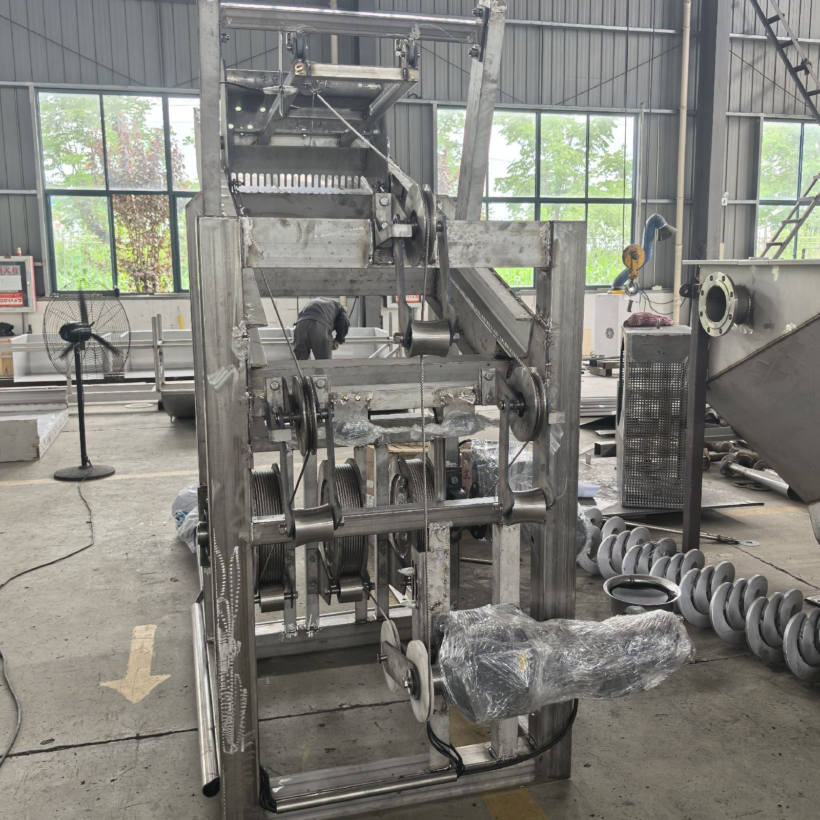 本机由机架、钢绳驱动及过扭保护装置、二根牵引钢绳和置于中间的一根开闭耙钢绳、导向轮、松绳开关、耙斗开闭装置、耙斗及斗车、格栅、导轨及托渣板、撇渣板、导渣板、电控设备等构成。