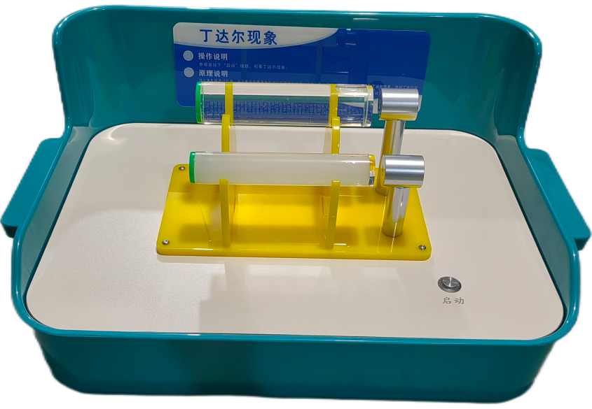 | 丁达尔现象 | 外形尺寸:543×400×220mm 箱体:ABS一体注塑成型;整体圆润,无棱角、锐角;分为上下两层,下层储物收纳;可堆叠,方便运输,两侧带有把手,便于搬运;台面采用耐磨、抗刮伤材料;说明牌置于展箱上层箱体内侧,尺寸≥:300mm*100mm。 功能概述:展项由激光和一管胶体构成。观众按下启动按钮,启动激光, 可在胶体中看到激光的路径。 科学原理:当一束光线透过胶体,从入射光的垂直方向可以观察到胶体里 出现的一条光亮的“通路”,这种现象叫丁达尔现象,也叫丁达尔效应、 丁泽尔现象、丁泽尔效应。在光的传播过程中,光线照射到粒子时,如果 粒子大于入射光波长很多倍,则发生光的反射;如果粒子小于入射光波 长,则发生光的散射,这时观察到的是光波环绕微粒而向其四周放射的光,称为散射光或乳光。 |