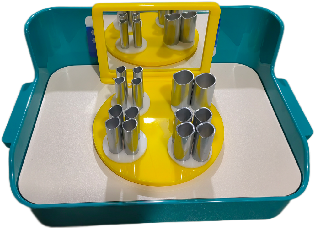 | 魔镜 | 外形尺寸:543×400×220mm 箱体:ABS一体注塑成型;整体圆润,无棱角、锐角;分为上下两层,下层储物收纳;可堆叠,方便运输,两侧带有把手,便于搬运;台面采用耐磨、抗刮伤材料;说明牌置于展箱上层箱体内侧,尺寸≥:300mm*100mm。 原理说明:为何从某些角度观察时,模型的实际开口形状与在镜中的形状不同呢?物体的形象通过眼睛传递给大脑,经大脑处理,使我们理解。然而我们的大脑在处理外形时,总是倾向于将物体处理成我们熟悉的形状,舍去一些多余的,或者弥补原本没有的细节。展品中模型开口的边,既不是简单的直线,也不是圆弧,而是一侧凹一侧凸,像一个躺着的S形。从凹的一侧观察时,对侧凸曲线看起来更像圆弧,大脑把这个古怪几何体理解成我们熟悉的圆柱体。此时,镜中的物体则相当于从凸的一侧观察,对侧凹曲线看起来更像直线,大脑把它理解成我们熟悉的长方体。 |