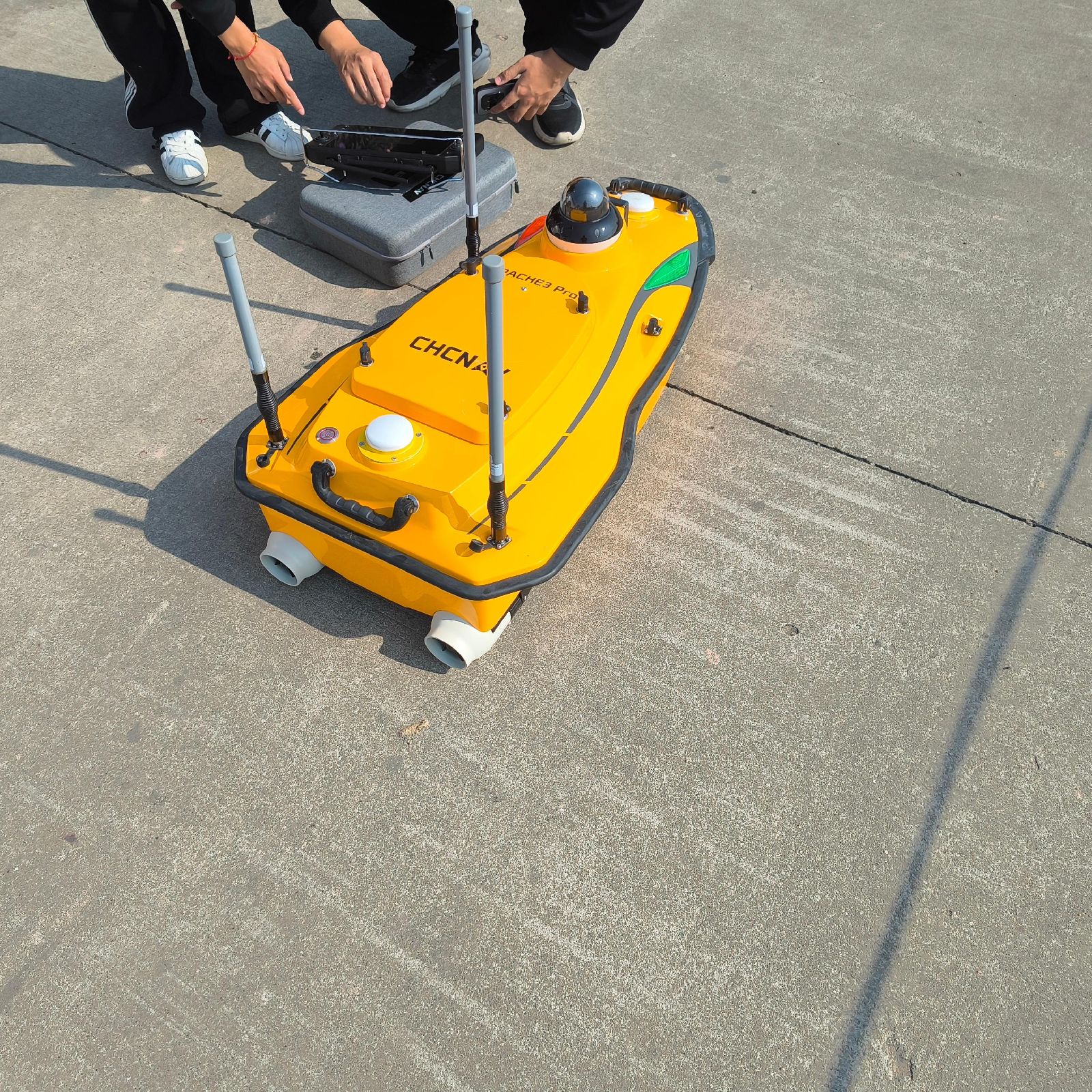 高强度高模量碳纤维 HPT 一体成型,黄色外观醒目;三体船设计配合 10cm 超浅吃水,能在浅滩、复杂水域作业;具备 RTK 厘米级定位 + IMU 惯导,穿桥洞、树荫下也不易丢点;支持手动 / 半自动 / 全自动模式,毫米波避障 + 浅滩倒车 + 低电量 / 失联返航,安全性强;4G + 数传电台双链路,数据本地 + 终端双存储。