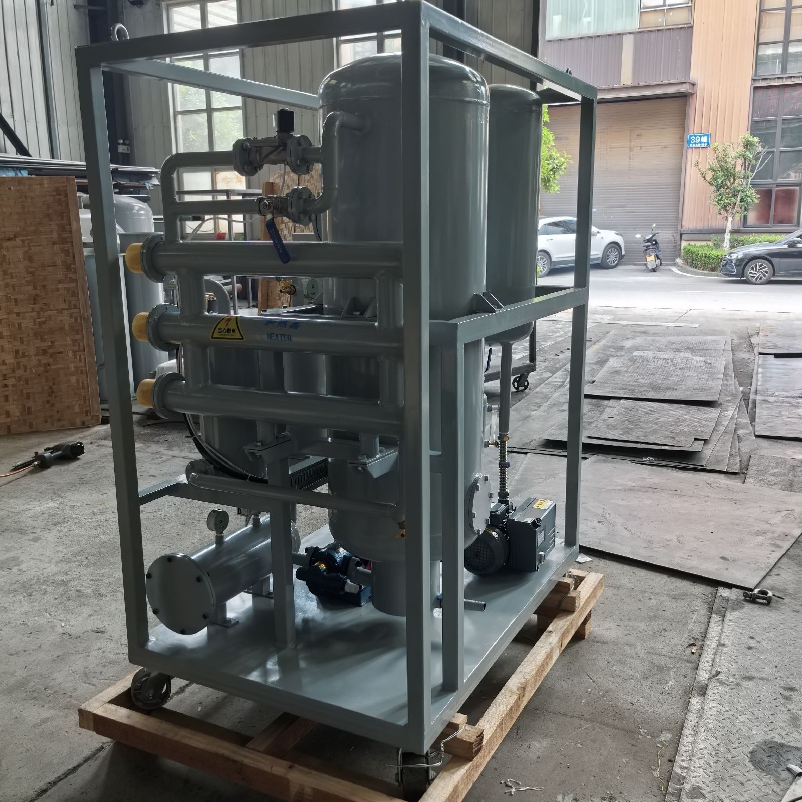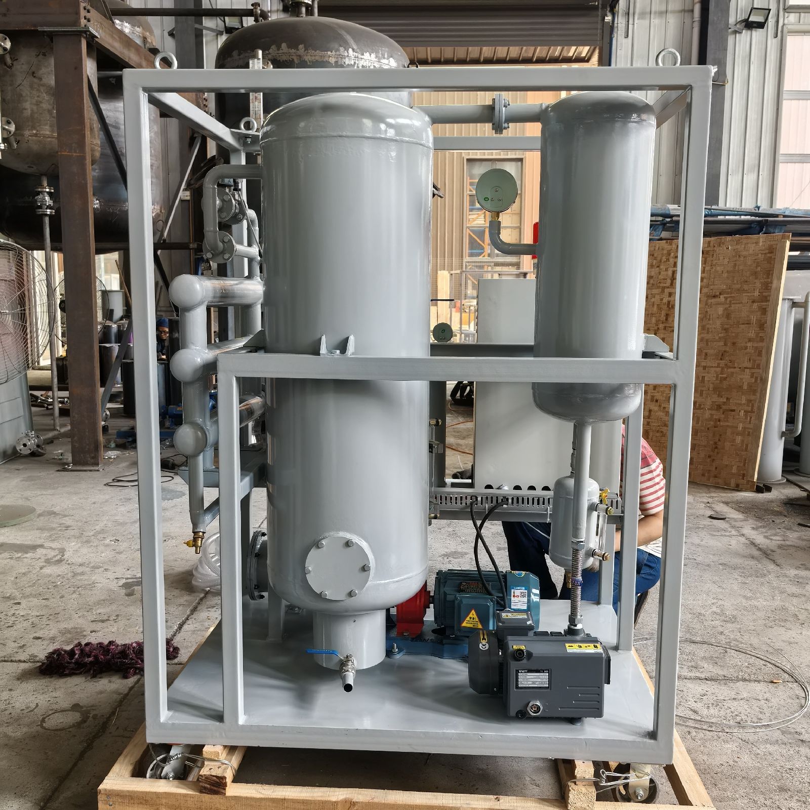 ◆ 真空系统:真空系统由真空分离器、真空泵、冷凝冷却器等部件组成。真空分离器内设有与型号匹配的蒸发单元,显著增加了蒸发面积,确保油液拥有充分的蒸发面。根据气体流动特性,这种设计有利于气体被真空源快速抽出。真空泵的抽速能力大于蒸发出的水蒸汽和析出气体总量的两倍,这有助于防止油液受到二次污染,并确保系统在极低气压状态下稳定运行。